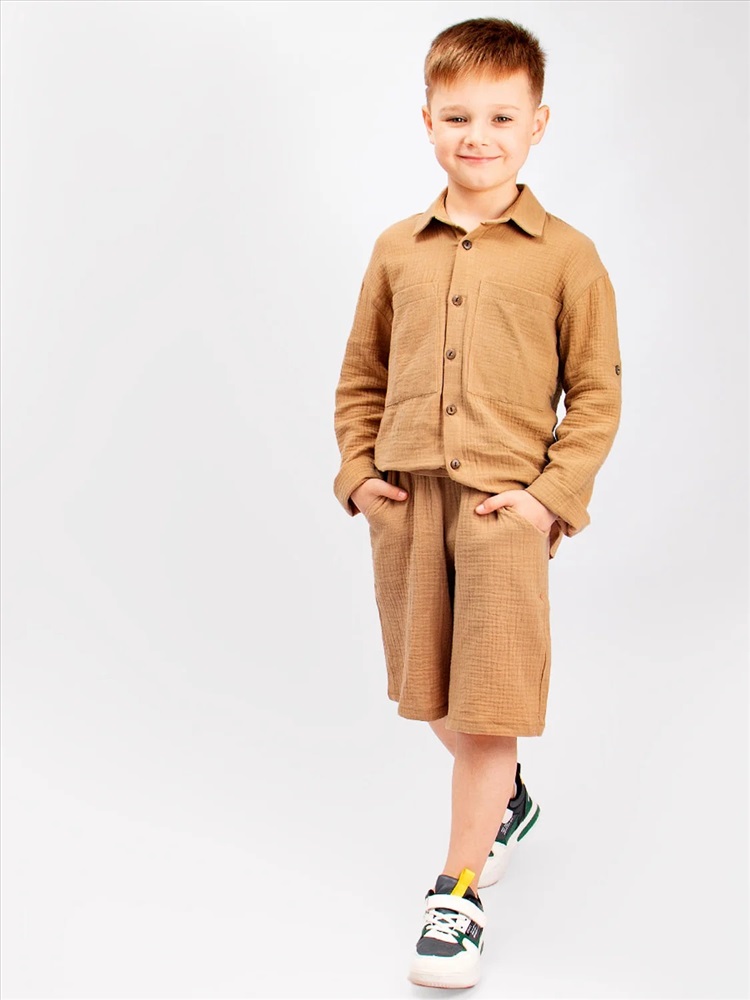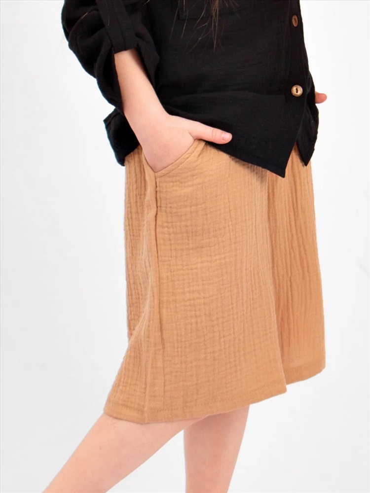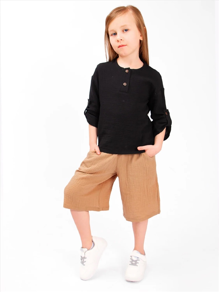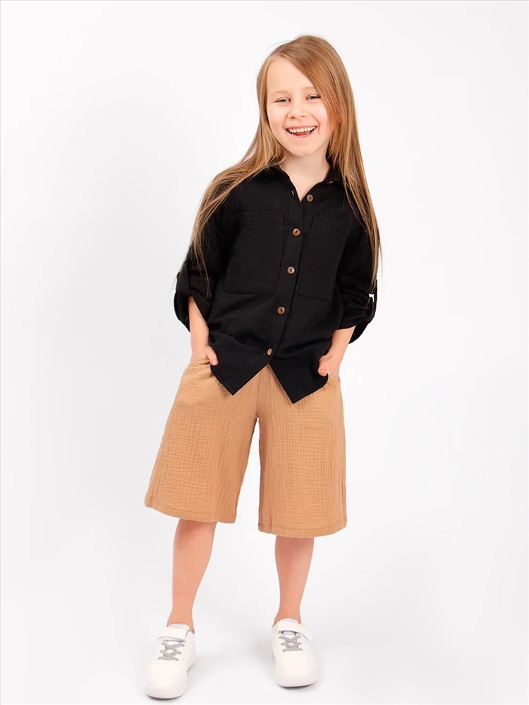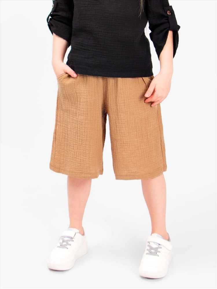 Шорты детские Соль&Перец из муслина. Ткань-двухслойный муслин, хорошо пропускает воздух, защищает от солнца, идеально подходит для чувствительной кожи. Модель шорт свободная, не сковывающая движений и немного удлиненная. Шорты из муслина имеют мягкую резиночку на поясе, по бокам карманы. Отличный вариант для летних прогулок, похода на пляж, отдыха на природе.