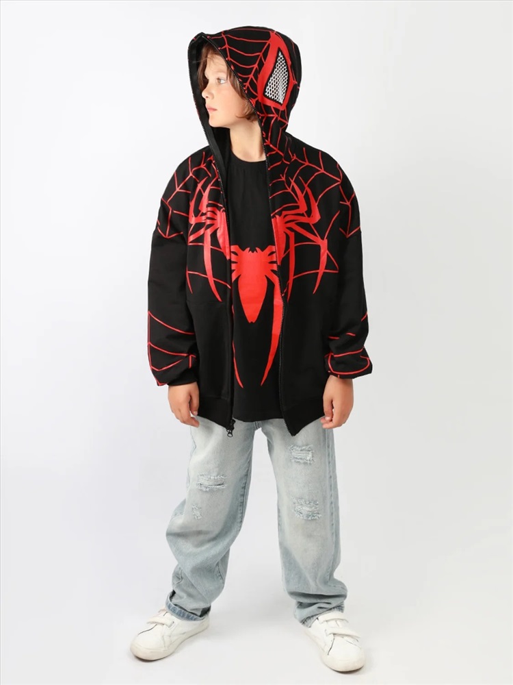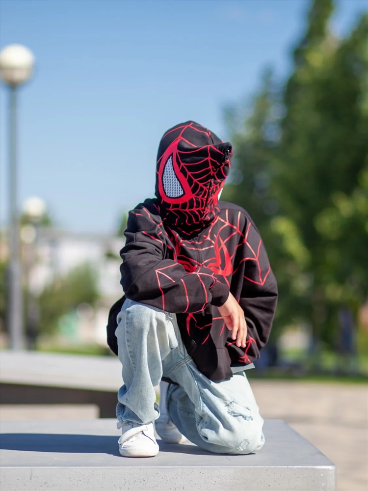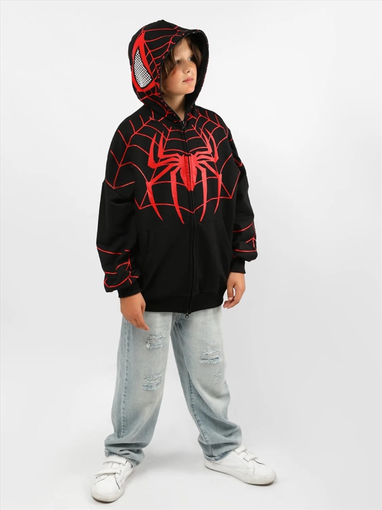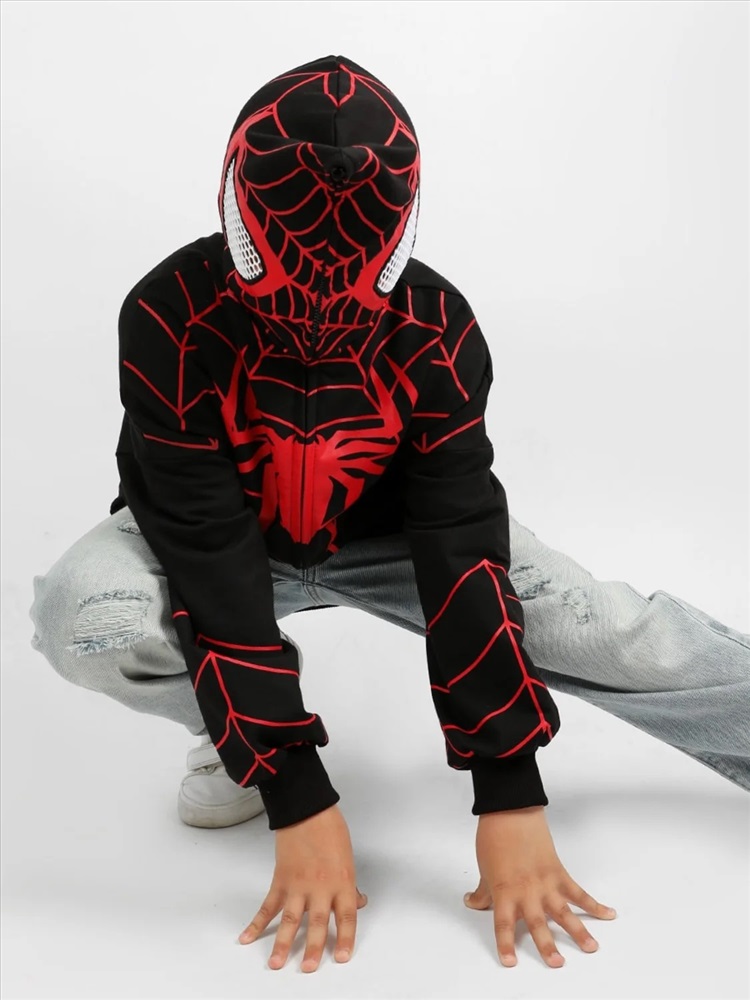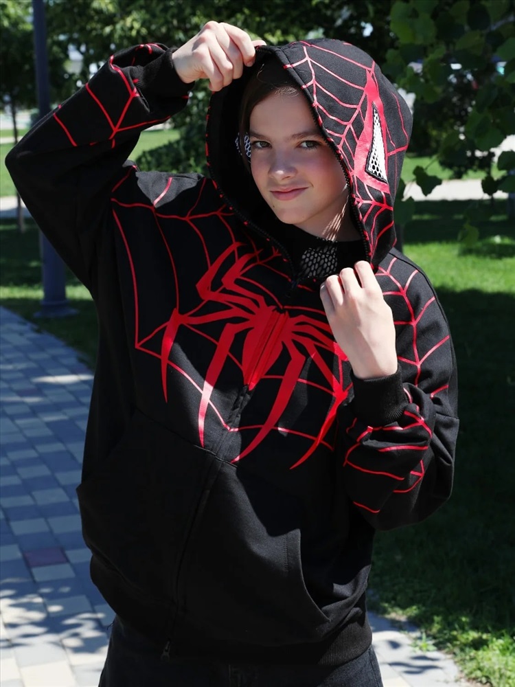 Толстовка Соль&Перец, силуэта оверсайз. Выполнена из плотного и эластичного материала «футер двухнитка», который хорошо пропускает воздух, не теряет форму и приятный к телу. Толстовка по всей длине на молнии, с маской человека паука на капюшоне и ярким принтом. Рукава и низ толстовки с широкими, эластичными манжетами.