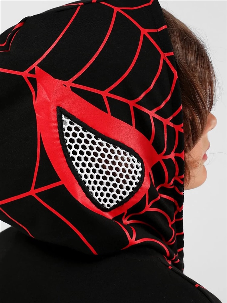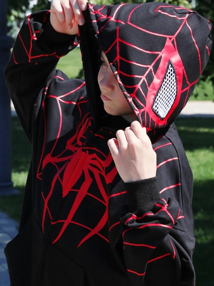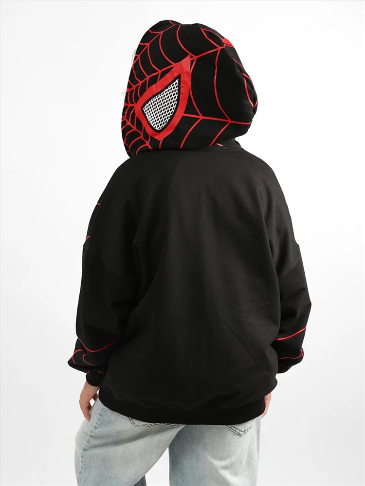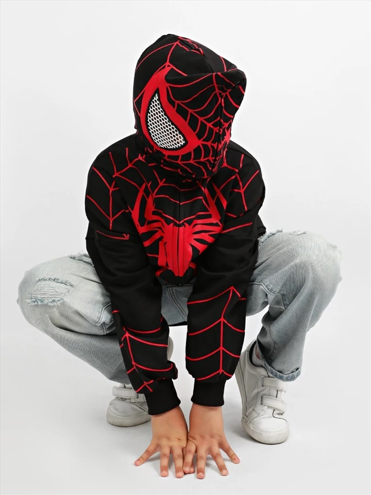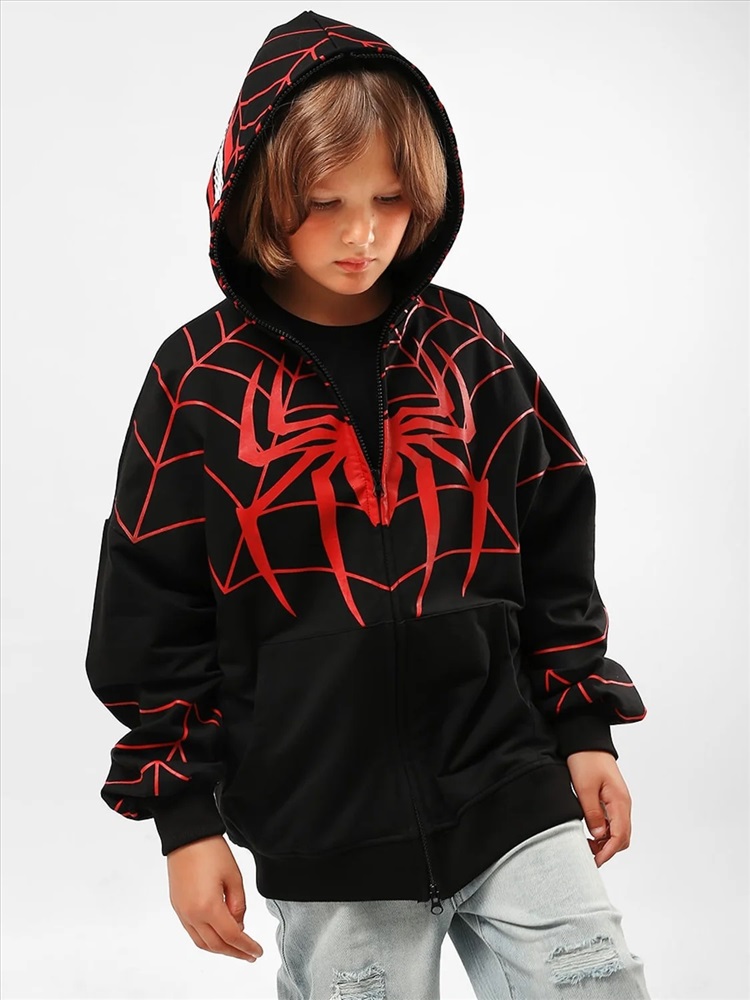 Толстовка Соль&Перец, силуэта оверсайз. Выполнена из плотного и эластичного материала «футер двухнитка», который хорошо пропускает воздух, не теряет форму и приятный к телу. Толстовка по всей длине на молнии, с маской человека паука на капюшоне и ярким принтом. Рукава и низ толстовки с широкими, эластичными манжетами.