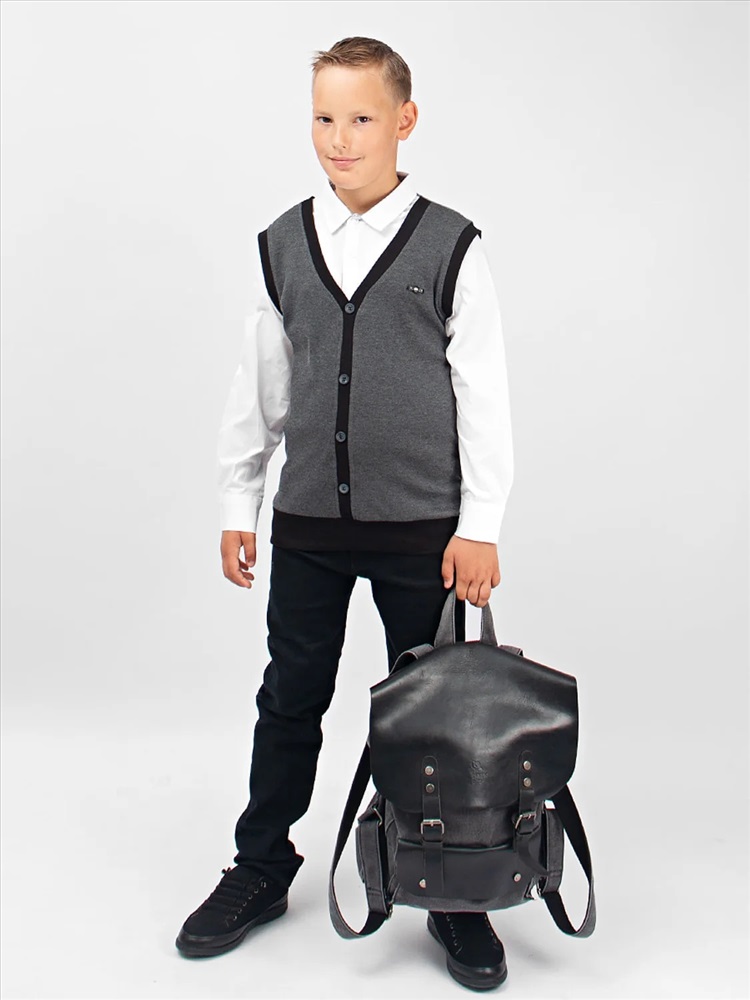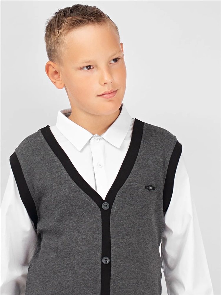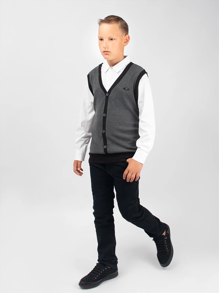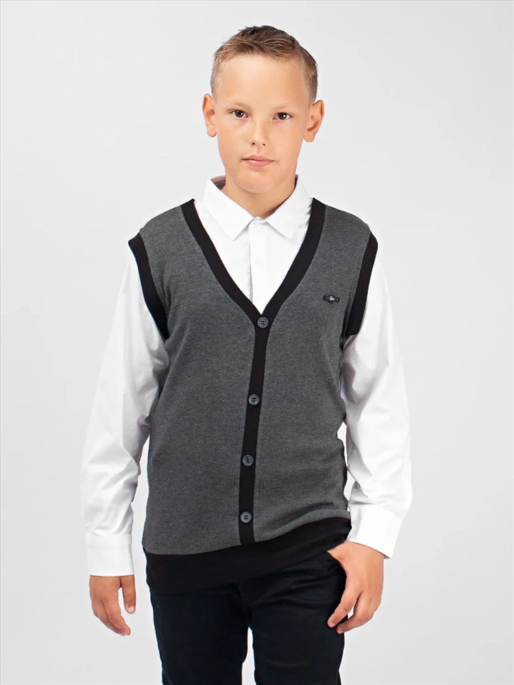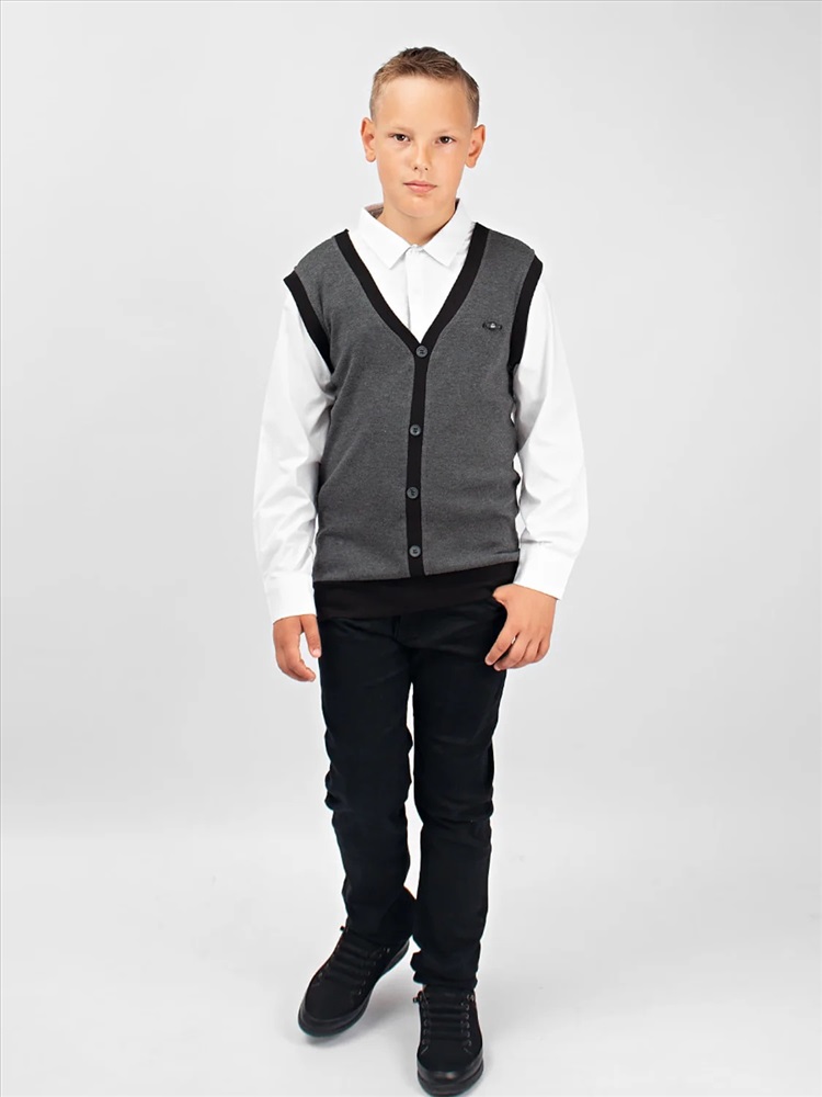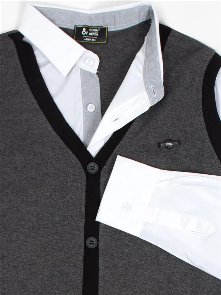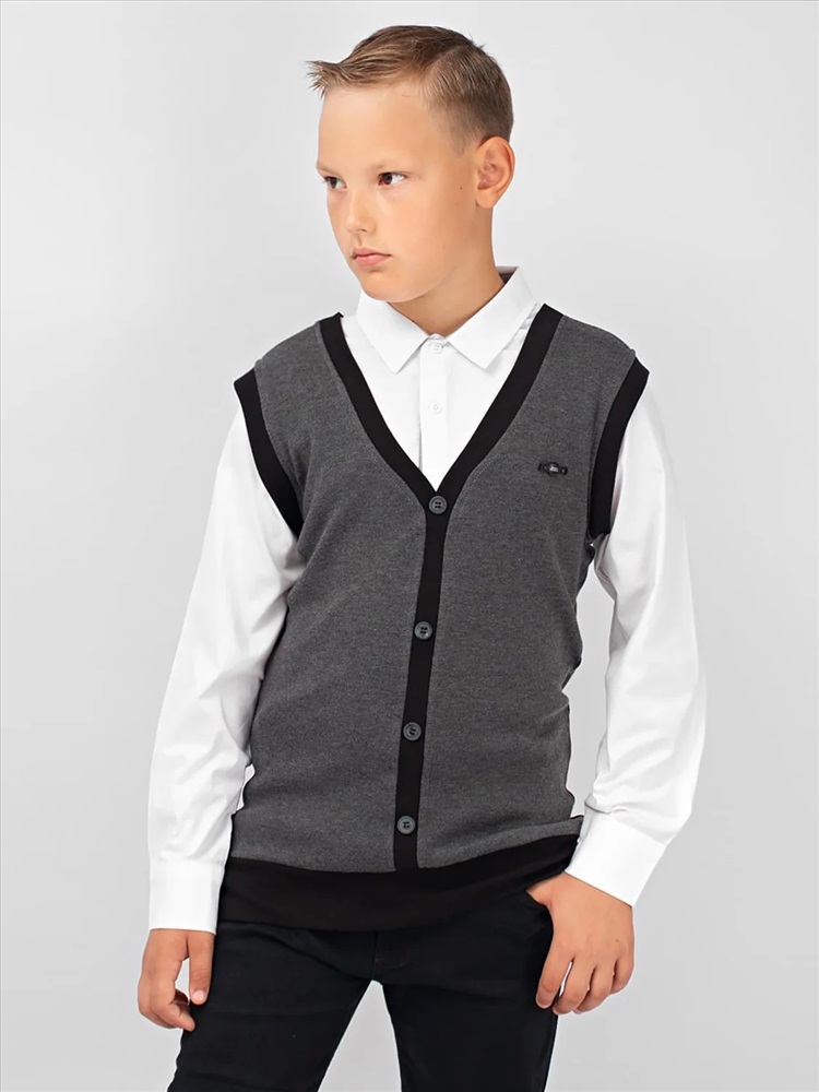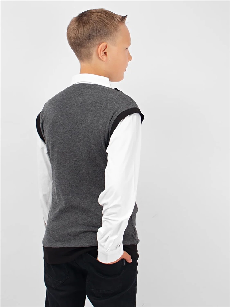 Джемпер-обманка с имитацией рубашки. Жилет с V-образным вырезом, выполнен из мягкого, приятного к телу трикотажа. По низу изделия - манжет. Имитация рубашки так же выполнена из натурального материала, на груди застегивается на две пуговицы. Идеальный выбор для создания классического школьного образа.
