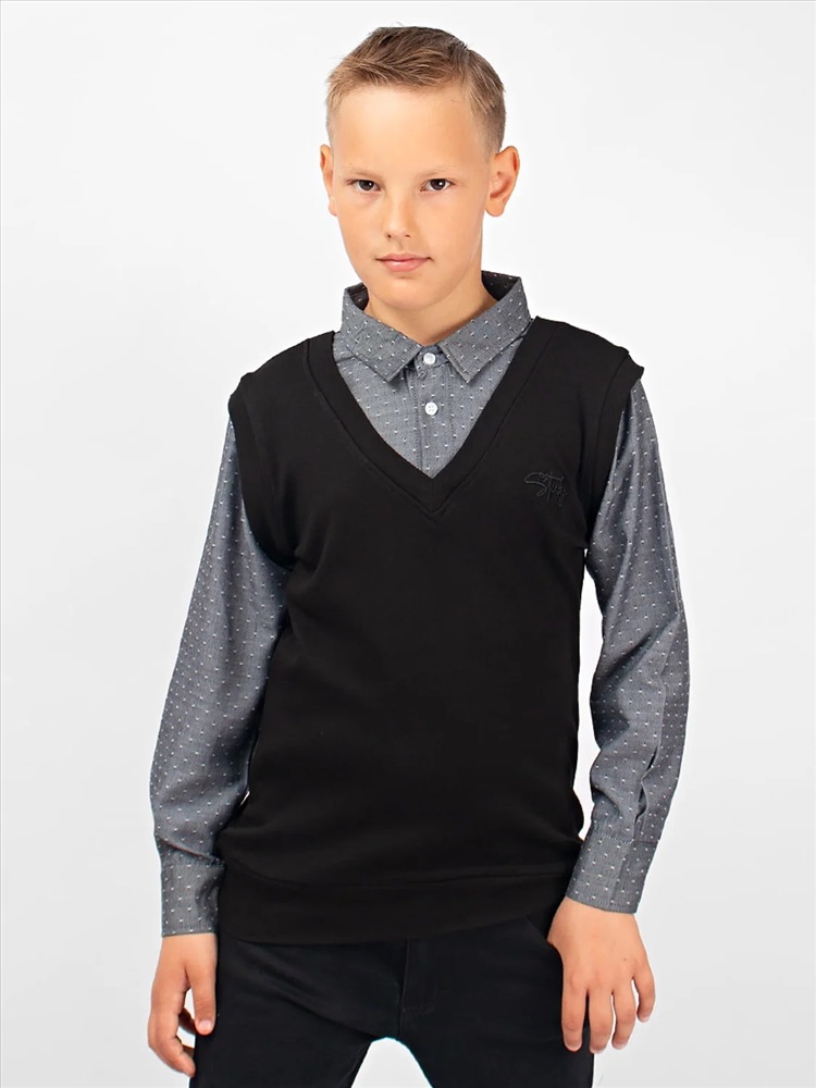 Джемпер-обманка с имитацией рубашки. Жилет с V-образным вырезом, выполнен из мягкого, приятного к телу трикотажа. По низу изделия - манжет. Имитация рубашки так же выполнена из натурального материала, на груди застегивается на две пуговицы. Идеальный выбор для создания классического школьного образа.