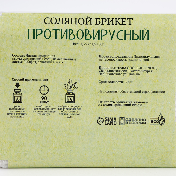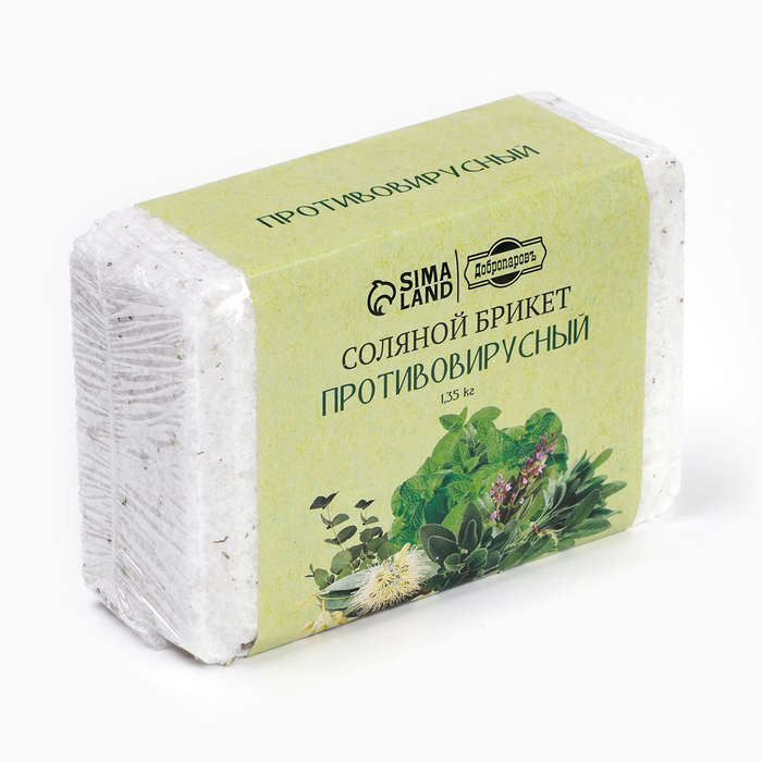 Соляной брикет «Противовирусный» (эвкалипт, шалфей, мята), 1,35 кг, Добропаровъ — натуральное средство для поддержания здоровья и создания комфортной атмосферы в помещении. Брикет из гималайской соли насыщает воздух микроэлементами, а добавленные эфирные масла эвкалипта, шалфея и мяты способствуют очищению дыхательных путей и повышению иммунитета.