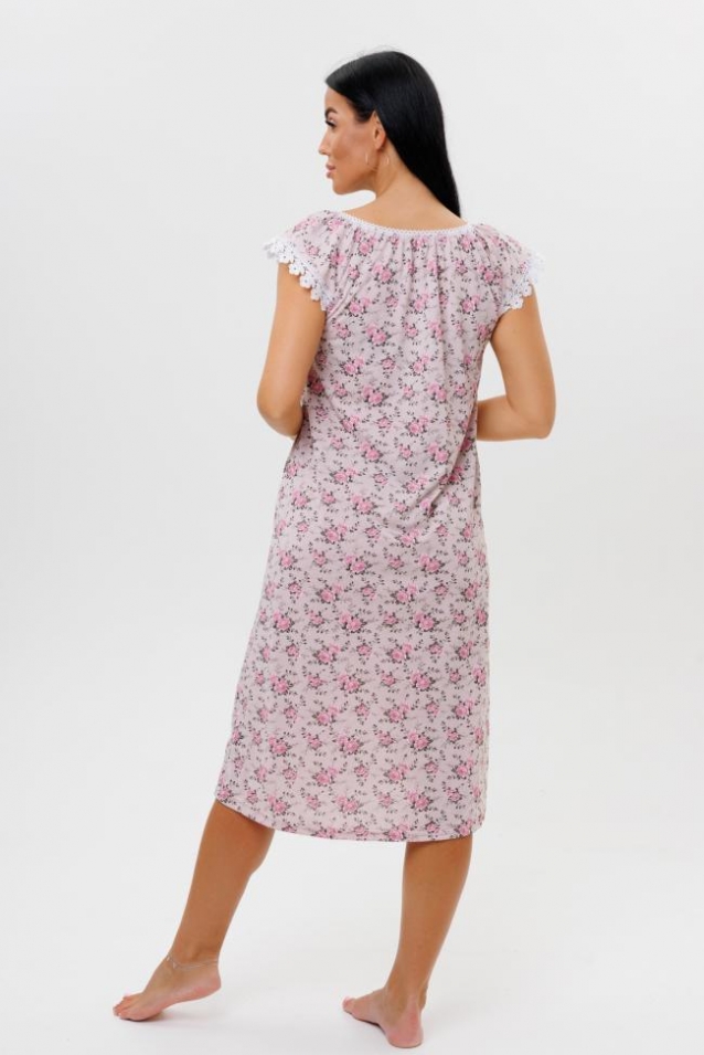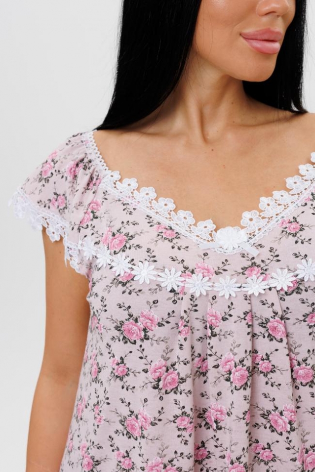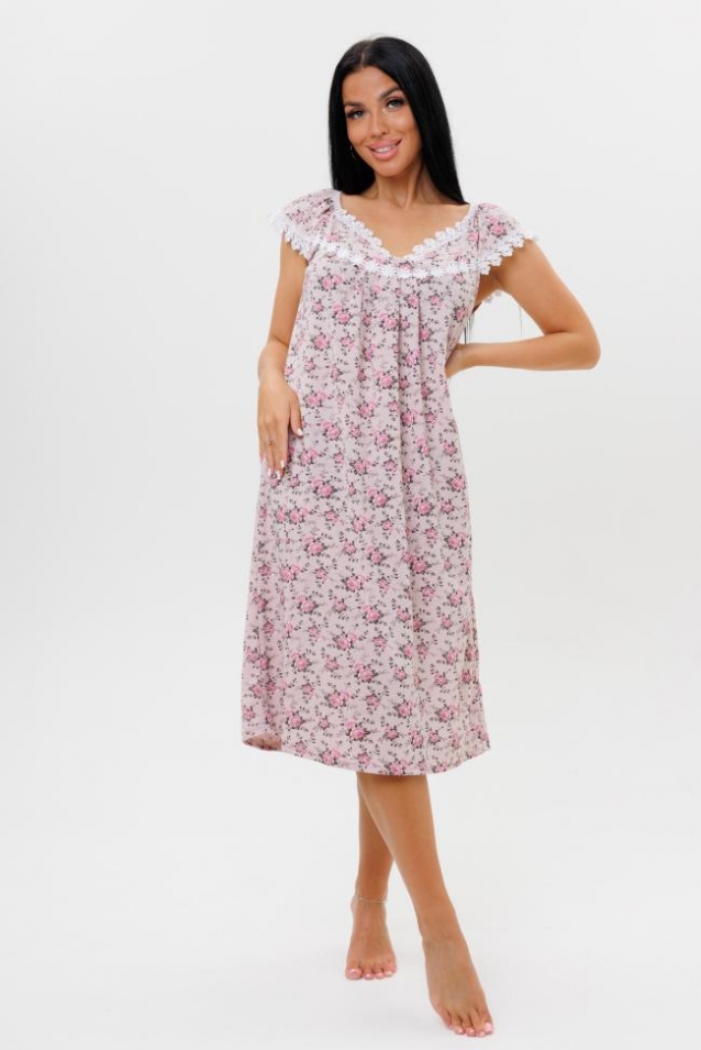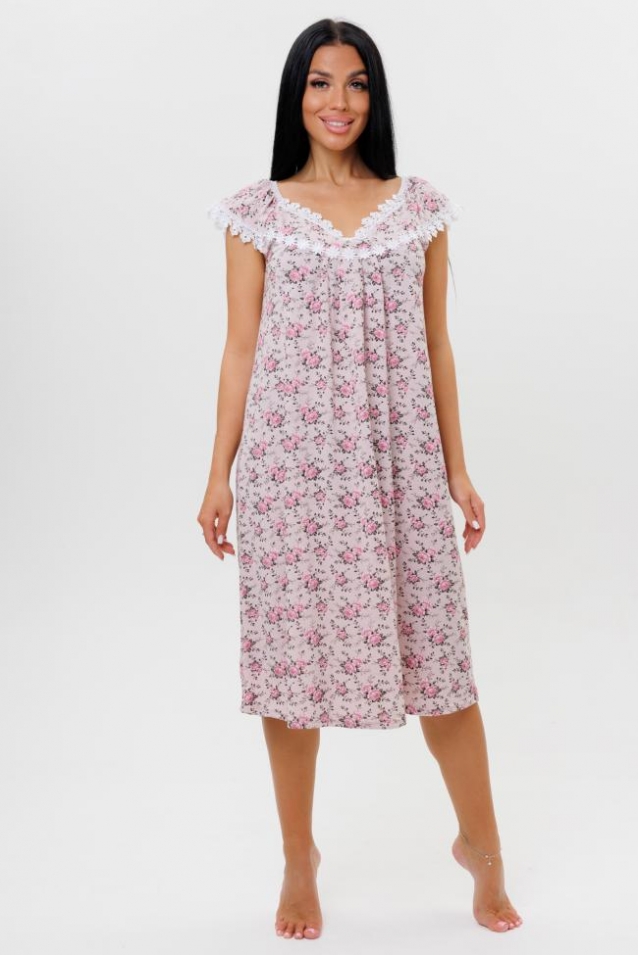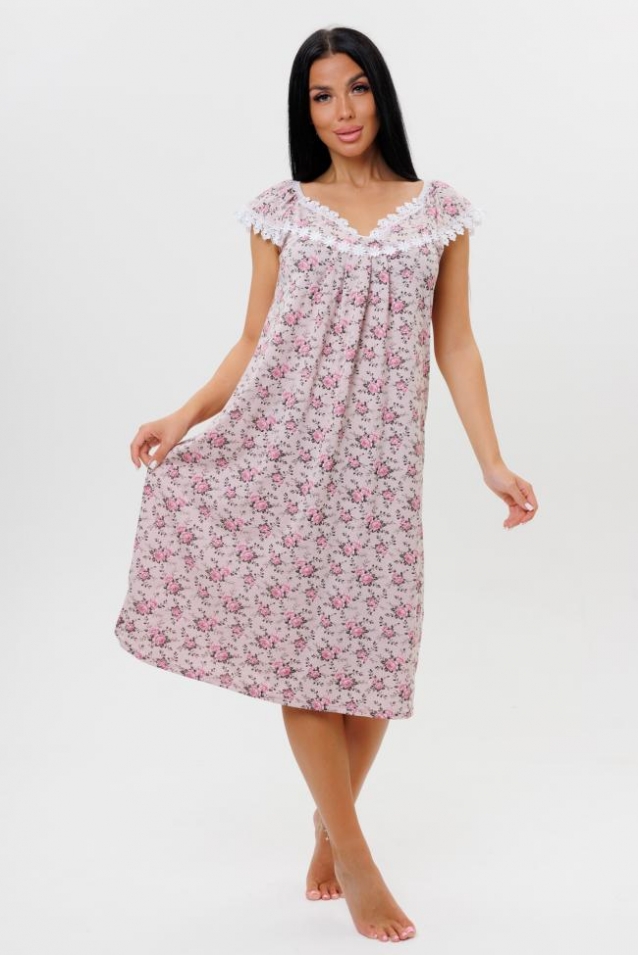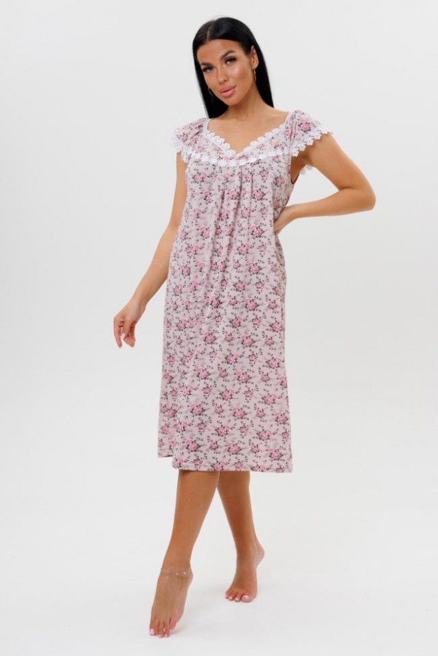 Оригинальная ночная сорочка выполнена из кулирки. Женственность этой сорочке придает вырез декольте, кокетка на груди со складками, отделанные кружевом.