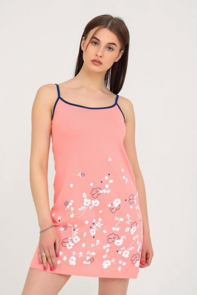 Сорочка из кулирки, на тонких бретелях, имеется принт, длина чуть ниже середины бедра.