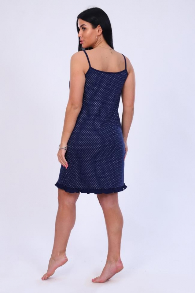 Трикотажная женская сорочка на тонких бретелях, глубоким вырезом и отрезным лифом. В виде акцента добавлена имитация пуговок, по низу рюша. Комфортна для повседневной носки и сна.