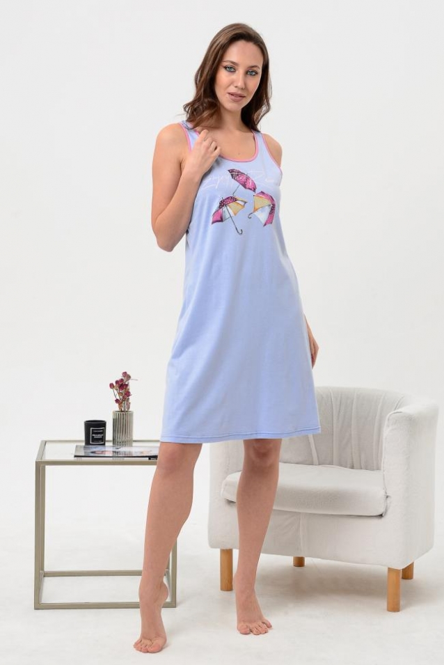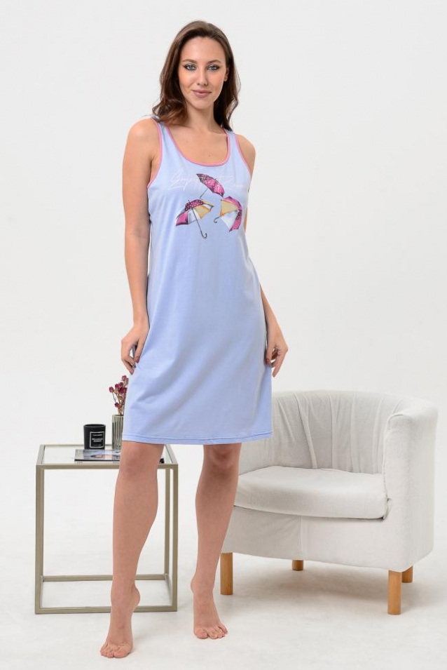 Сорочка из кулирного полотна 100% хлопок. Вырез горловины круглый, спина открытая на бретелях, низ подогнут на плоскошовной машине, на полочке принт. Сорочка удобна для сна, ваше тело будет дышать за счет натурального состава ткани. Легкая в уходе.