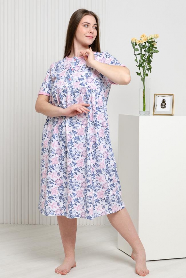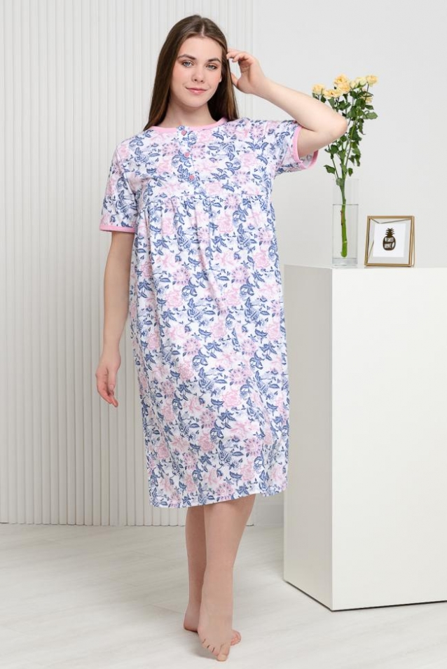 Сорочка женская из кулирного полотна, 100% хлопок. Сорочка свободного кроя, горловина круглая, обработана окантовкой, на кокетке прорезная планка на пуговицах, рукава обработаны окантовкой, низ сорочки подогнут на плоскошовной машине. Эта сорочка идеальна для сна, не сковывает движений. Легкая в уходе.