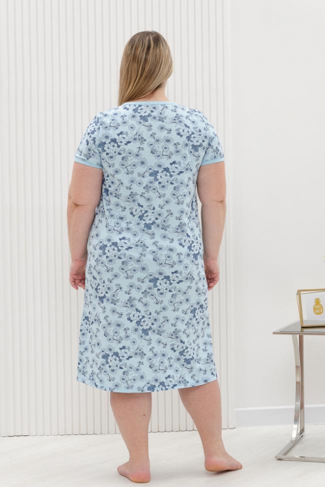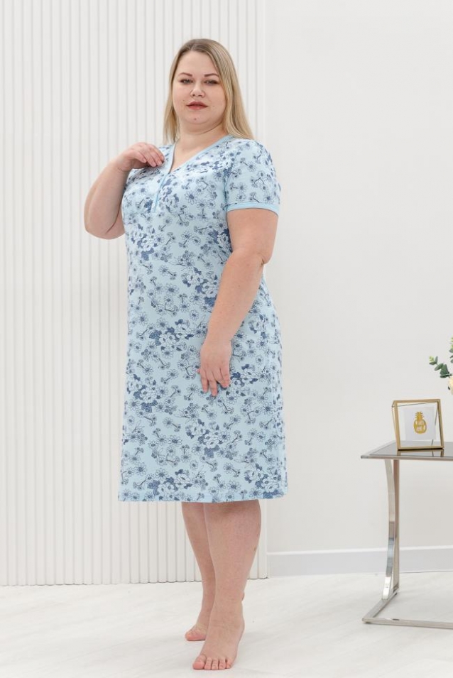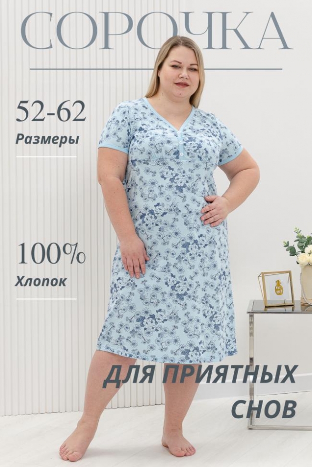 Сорочка женская из кулирного полотна, 100% хлопок. На полочке разрезная кокетка, горловина обработана окантовкой, на планке декоративные пуговицы, низ рукавов окантован, низ изделия обработан на плоскошовной машине. Сорочка удобна и комфортна для сна. Легкая в уходе.