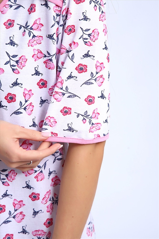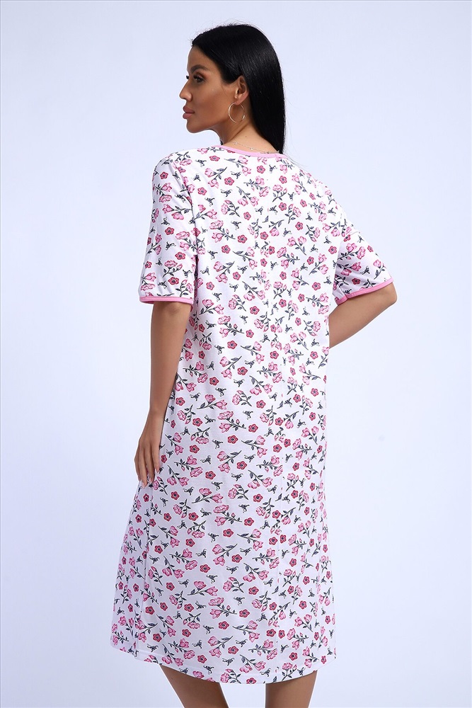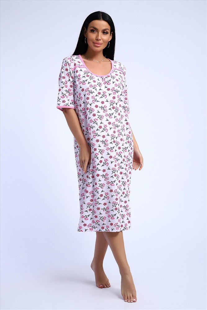 Сорочка из белоземельной хлопковой кулирки с нежным цветочным рисунком, рукава до локтя.