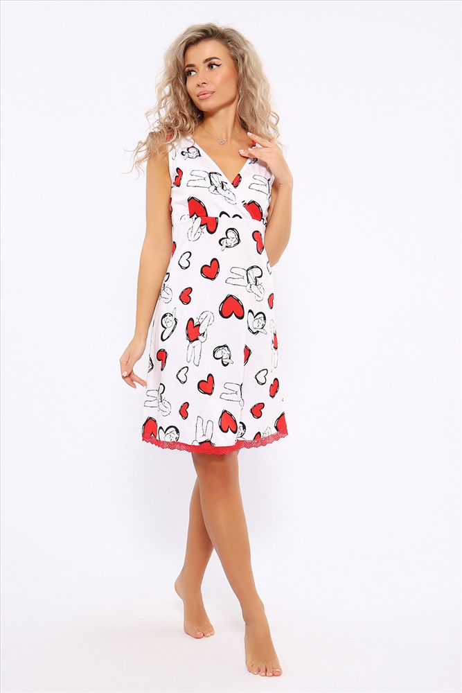 Стиль: домашний Сорочка женская с V-оборазным вырезом, без рукава с запахом. Данная модель выполнена из трикотажного полотна кулирка (хлопок 100%). Горловина и пройма обработана окантовкой из основной ткани. Низ изделия украшен эластичным кружевом. Подходит для кормления малыша.