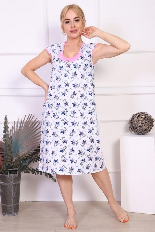 Женская сорочка из кулирки. Рукава очень короткие, окантовка, цветочный дизайн, две расцветки розовая и шоколадная, общая длина приблизительно до коленей. Размеры от 44 до 62.