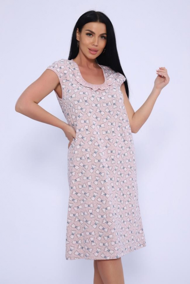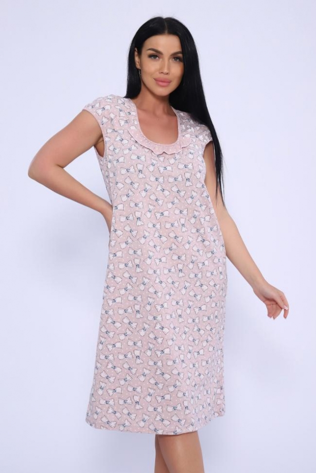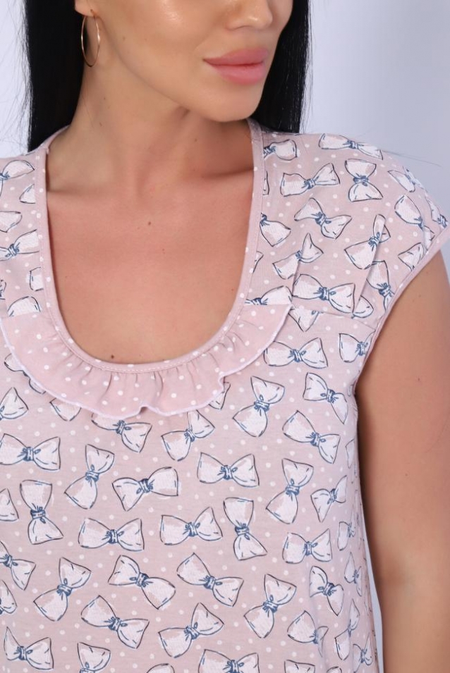 Женская сорочка из кулирки. Рукава очень короткие, окантовка, цветочный дизайн, две расцветки розовая и шоколадная, общая длина приблизительно до коленей. Размеры от 44 до 62.