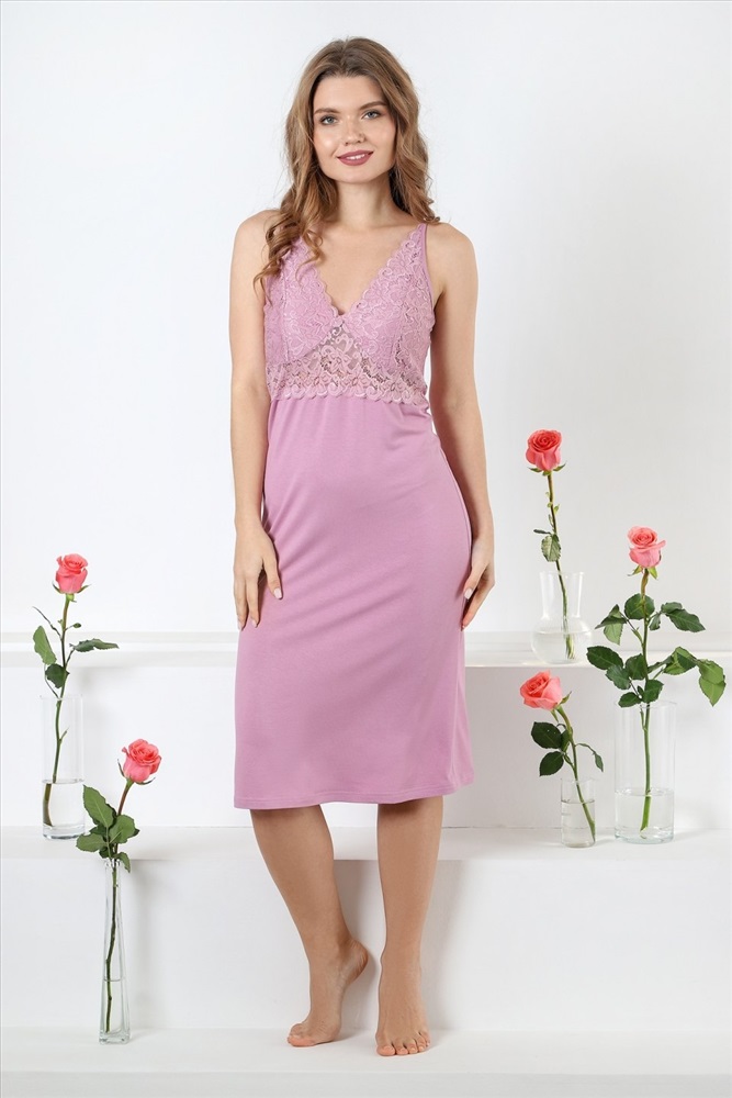 Сорочка из гладкокрашеного вискозного трикотажного, расширенная книзу, на узких бретелях, вытачанных из окантовки, с кружевным лифом «бюстье» на подкладке из основного материала и декоративной кружевной вставкой, соединяющей лиф и основную деталь переда. Верхний срез спинки и проймы окантованы основным материалом.