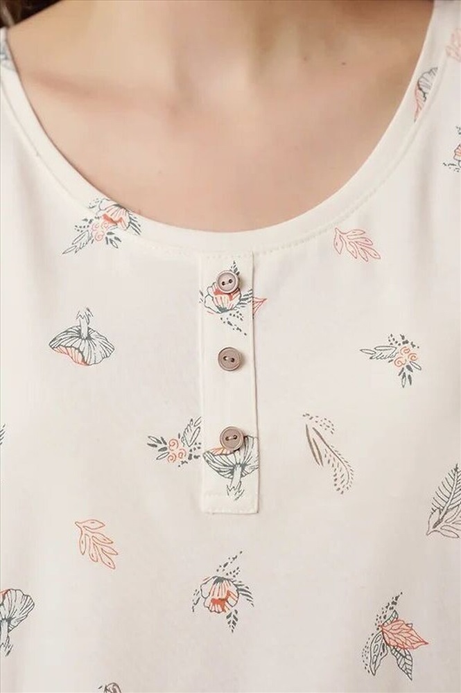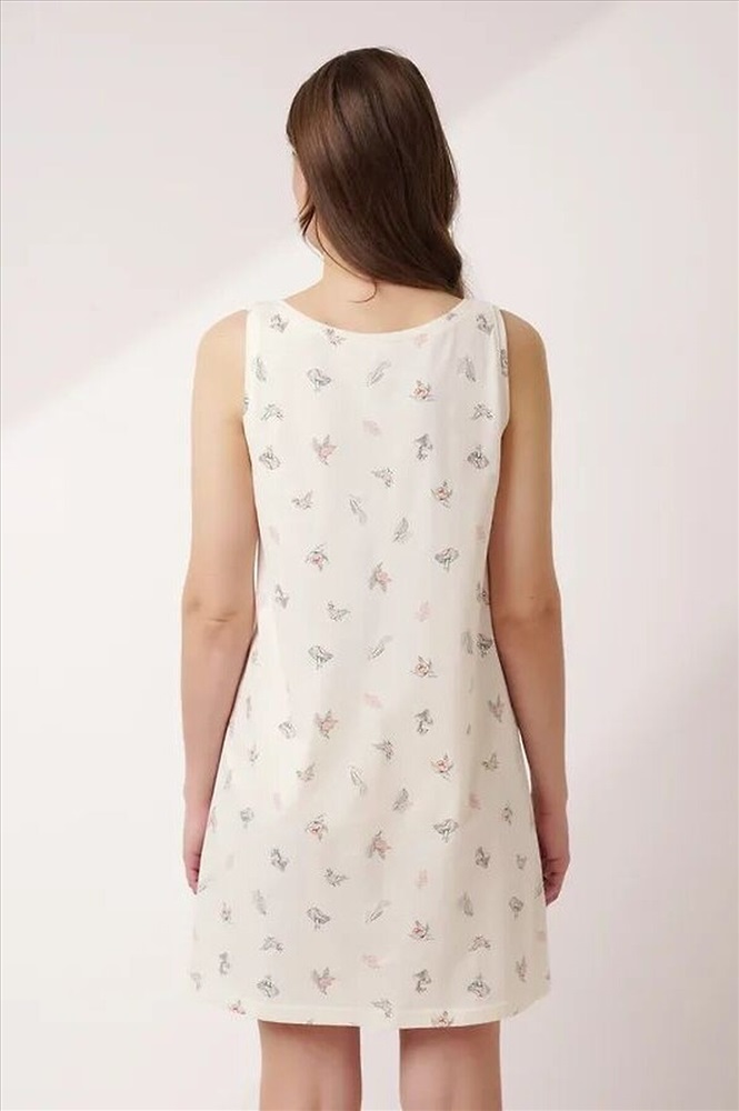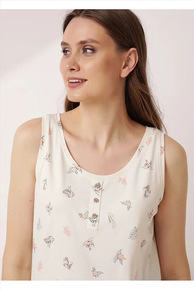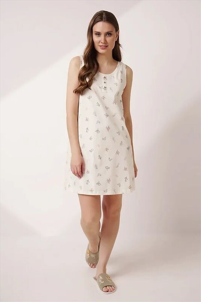 Ночная сорочка из хлопкового трикотажного полотна. А-образного силуэта длиной чуть ниже колена, на широких бретелях. Округлая горловина, спереди нефункциональная планка с пуговицами. По горловине и пройме обтачки.