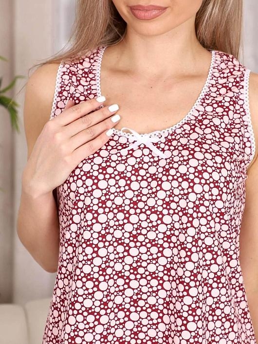 Сорочка женская, длиной выше колен на широких бретелях. Срезы пройм, горловины и низа изделия обработаны ажурной резинкой. На полочке по центру горловины в качестве декора расположен бант из атласной ленты.