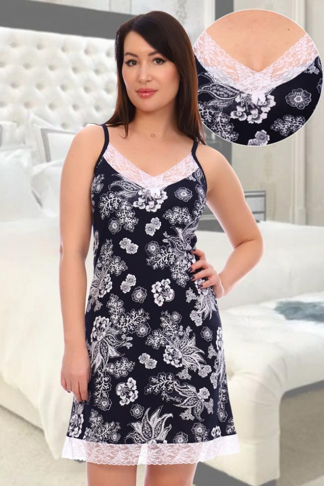 Сорочка женская с кружевом на бретелях. Данная модель выполнена из трикотажного полотна (кулирка). Полочка с V-образным вырезом. Низ изделия и горловина украшены эластичным кружевом шириной 5 см. Очень удобный крой и элегантность этой модели порадуют вас.