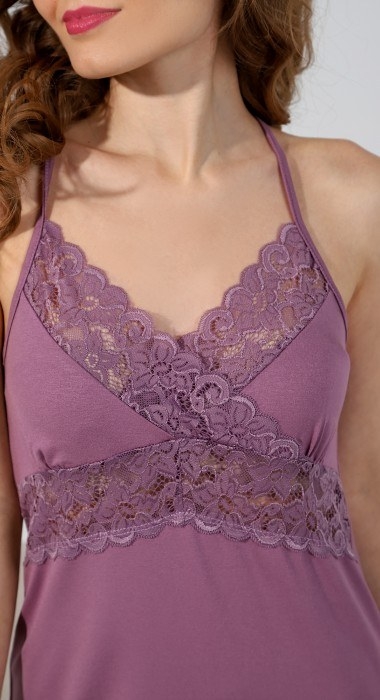 Сорочка молодежная из гладкокрашеного трикотажного вискозного полотна, на узких бретелях из окантовки, слегка расширенная книзу, с лифом «бюстье», отделанным кружевом по вырезу горловины и соединенным с основной деталью переда кружевной вставкой. Чашечки лифа присборены по нижним срезам и образуют спереди запах. Спинка - с кружевной деталью треугольной формы, соединенной с бретелями в вершине угла посредством пластмассового кольца. Для регулирования длины бретелей предусмотрены пластмассовые регуляторы. Верхний срез спинки и проймы окантованы основным материалом.