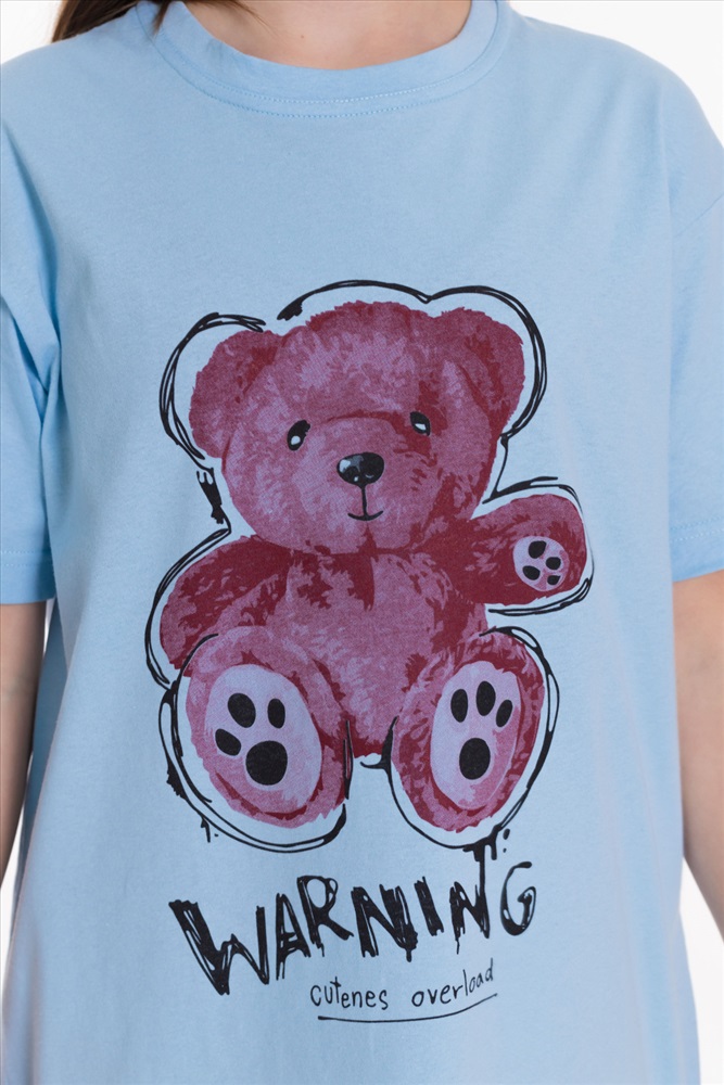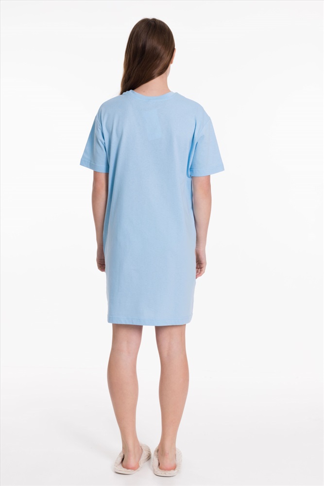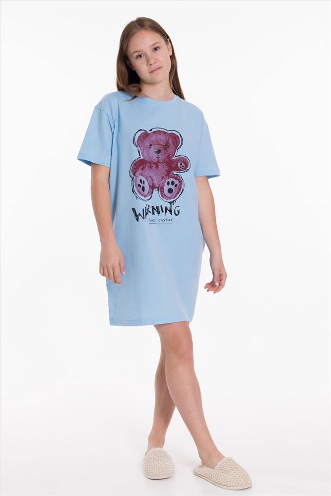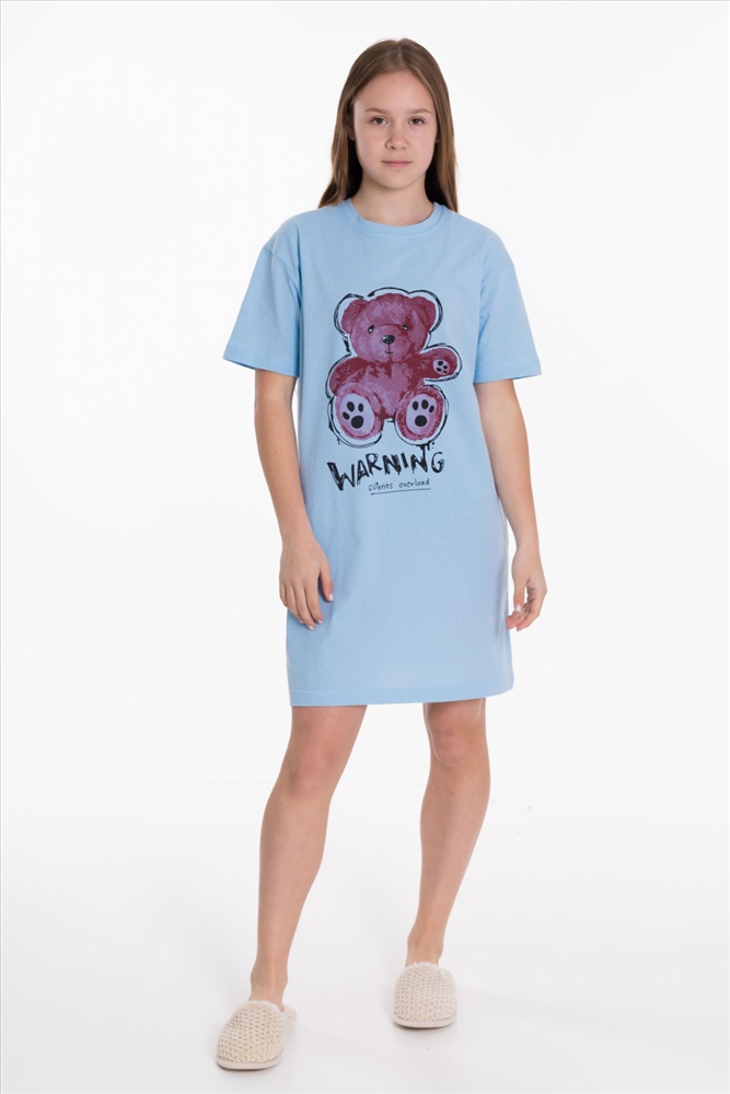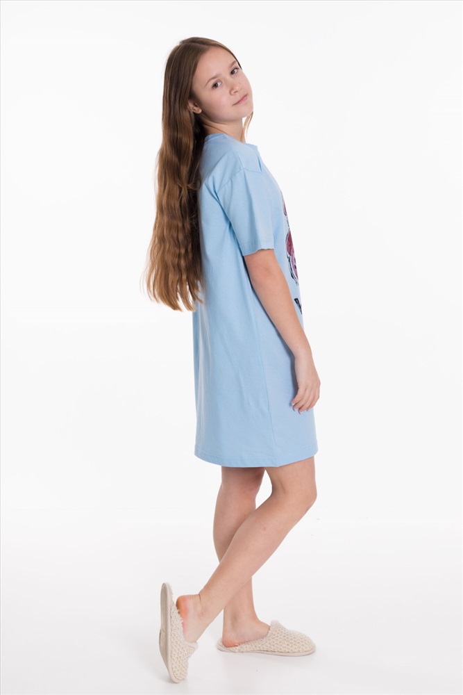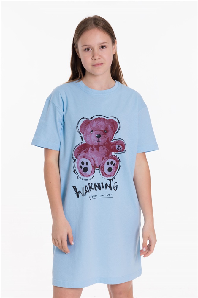 Цвет Номенклатуры: голубой Сорочка-футболка выполнена из однотонной кулирки. С коротким рукавом и принтом спереди. Круглый вырез горловины оформлен планкой.