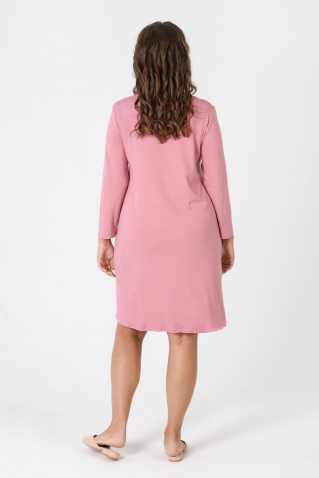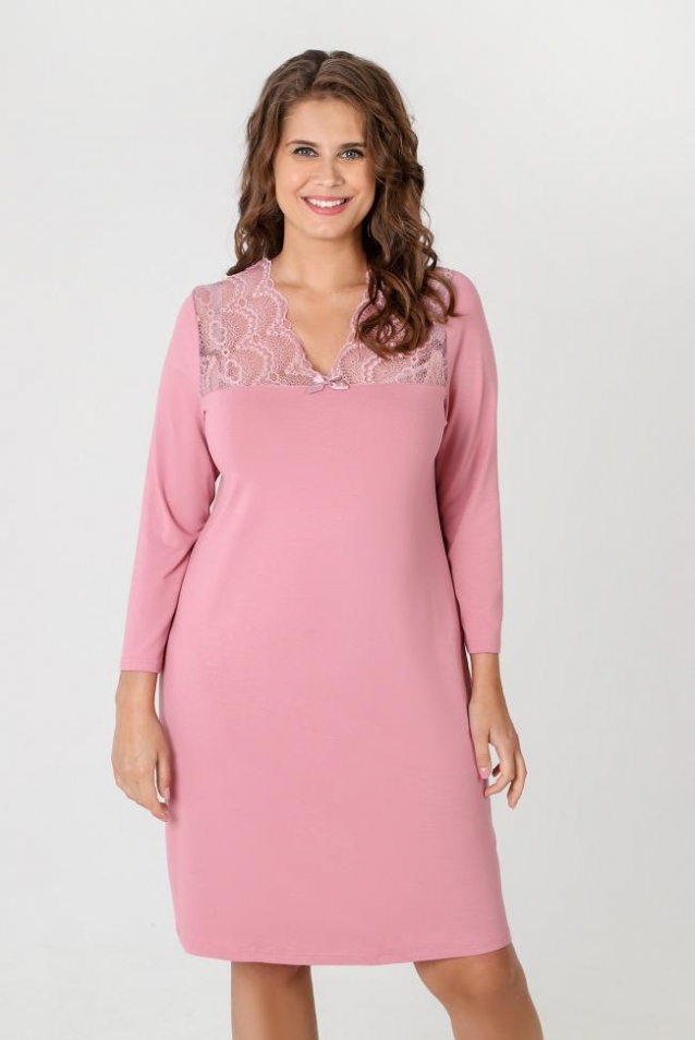 Сорочка женская из гладкокрашеного трикотажного вискозного полотна, прямого силуэта, с длинными втачными рукавами и горловиной V-образной формы. Перед с притачной кружевной кокеткой и декоративным бантиком из узкой атласной ленты в центре соединительного шва.