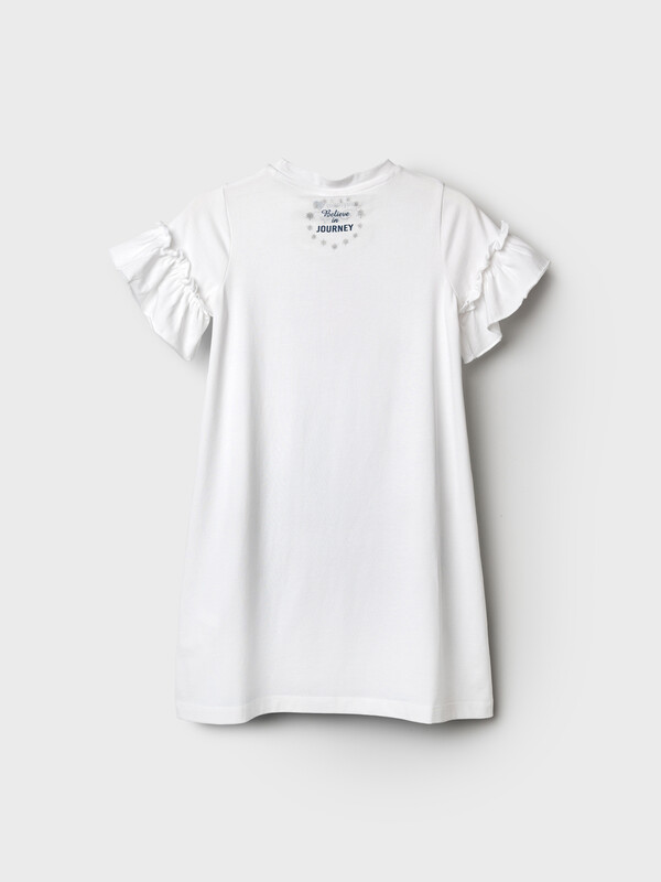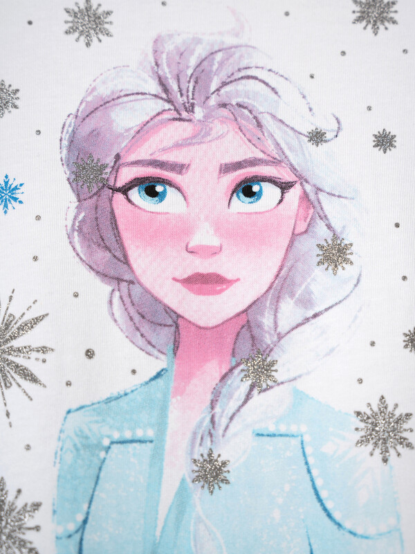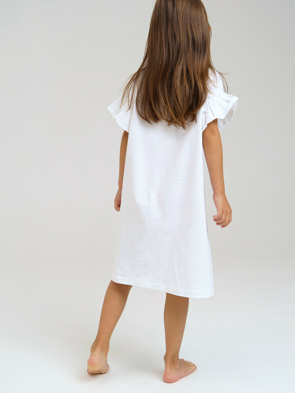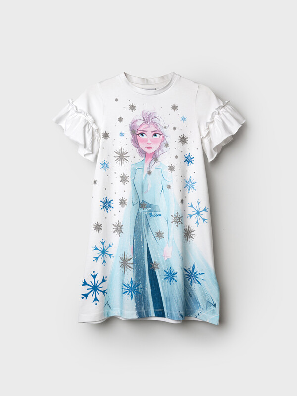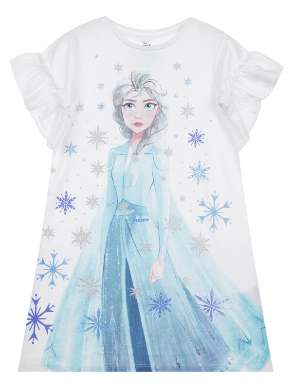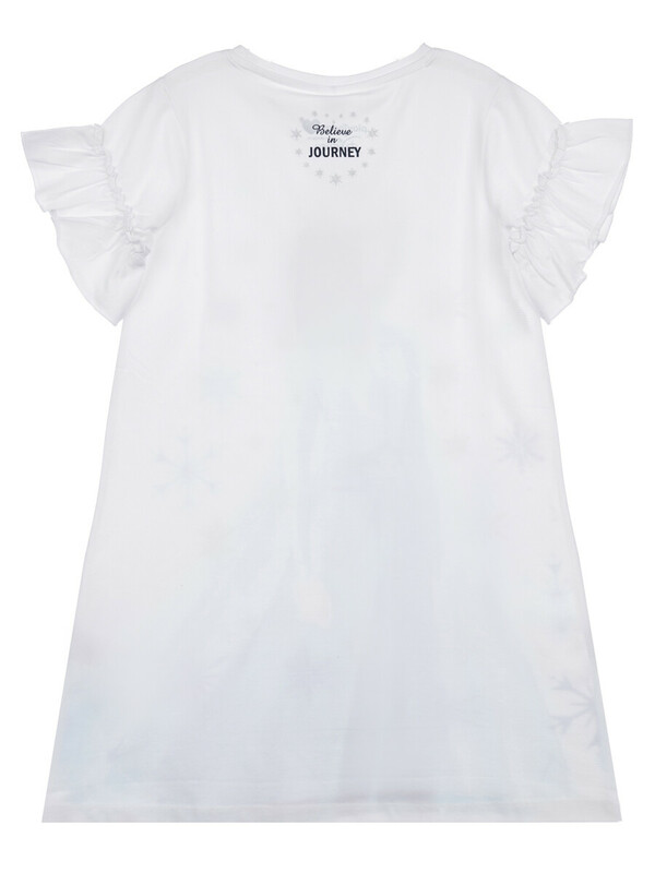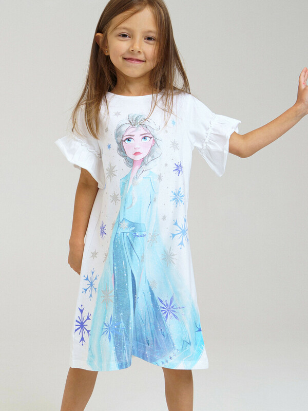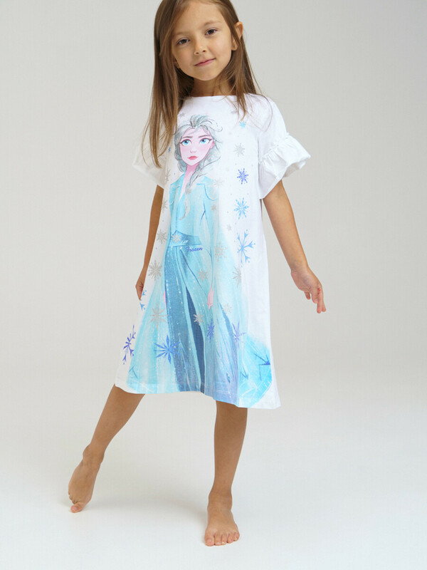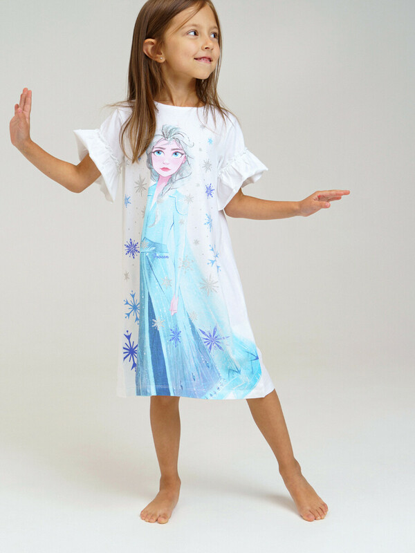 Ночная сорочка с принтом «Холодное сердце». Размер изделия на фото - 110, параметры модели (см): рост 110, обхват груди-талии-бедер: 55-54-55. Силуэт-трапеция. Рукава с оборками. Высокое содержание хлопка 95%. Благодаря наличию эластана в составе ткани изделие проще в уходе и держит форму.