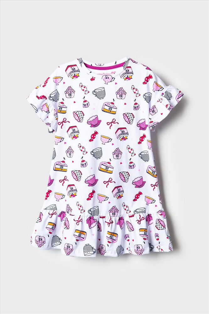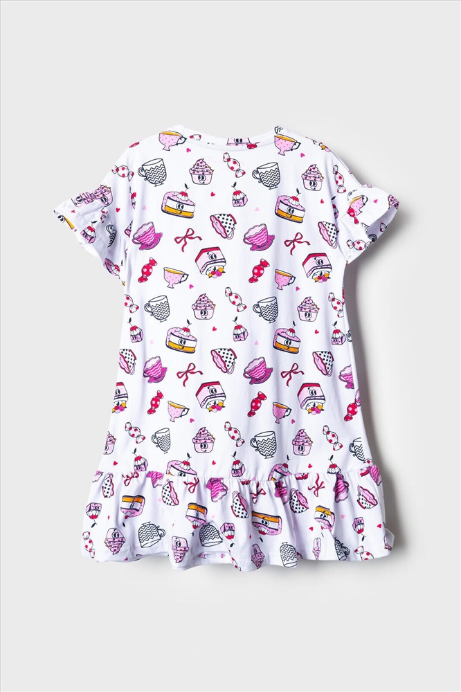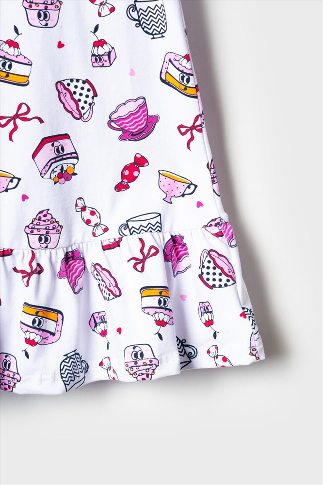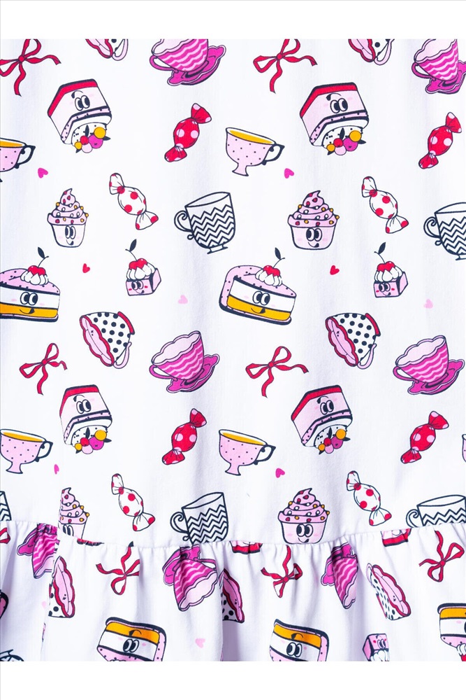 Детская ночная сорочка для девочки. Модель свободного кроя с короткими рукавами и широкой волнистой оборкой по низу. Изделие украшено ярким и забавным принтом с мультяшными десертами — пирожными, чашками, конфетами и другими сладостями. На рукавах — аккуратные оборки, добавляющие воздушности.