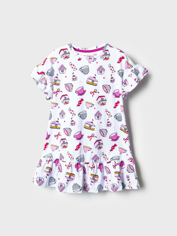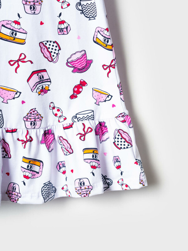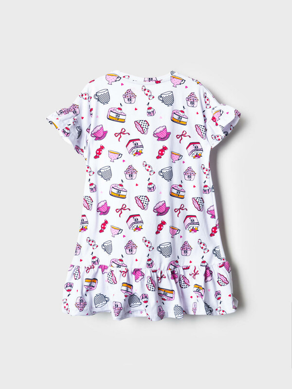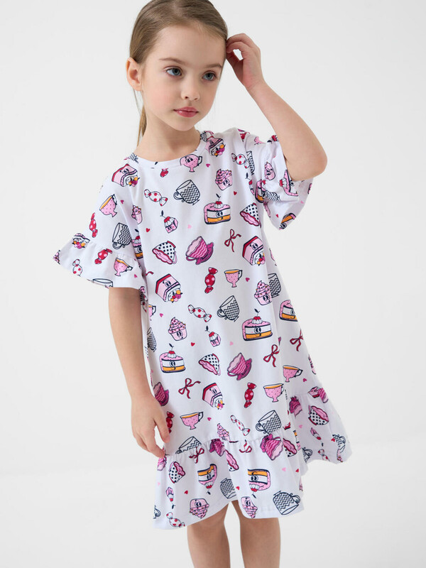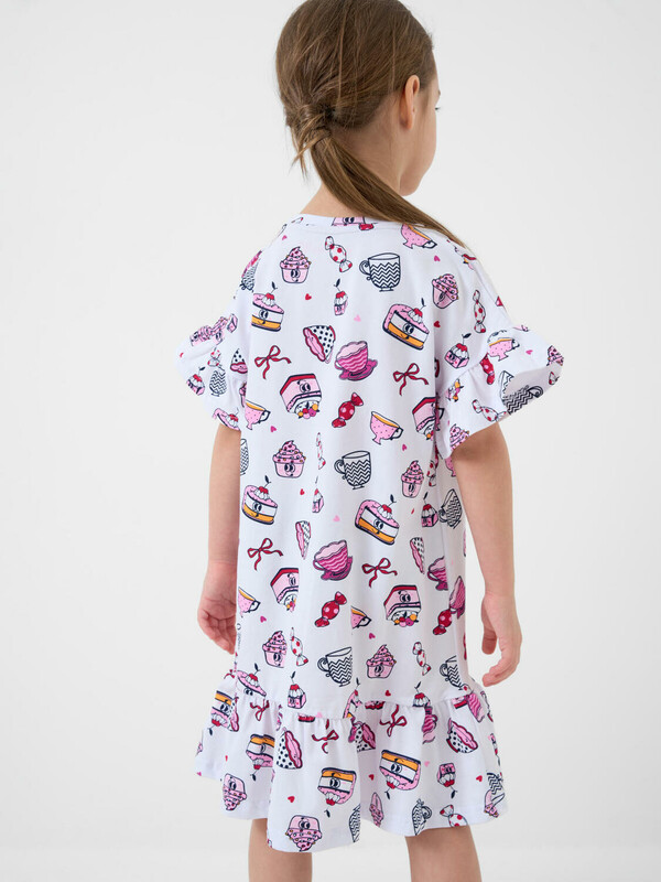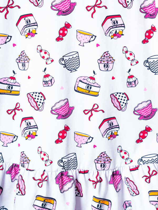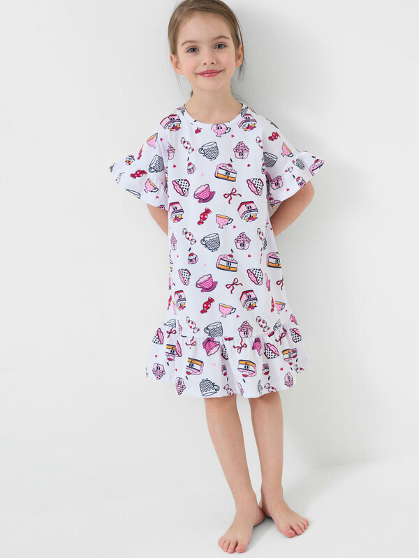 Детская ночная сорочка для девочки. Модель свободного кроя с короткими рукавами и широкой волнистой оборкой по низу. Изделие украшено ярким и забавным принтом с мультяшными десертами — пирожными, чашками, конфетами и другими сладостями. На рукавах — аккуратные оборки, добавляющие воздушности.
