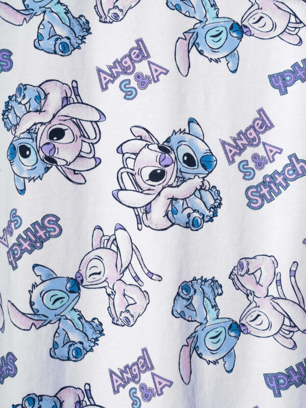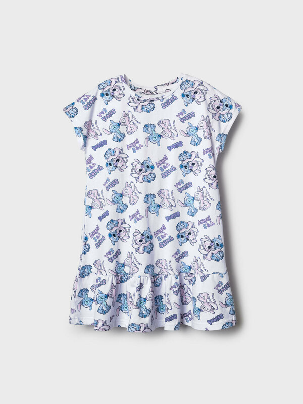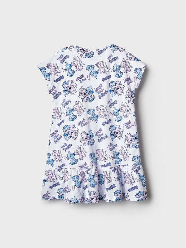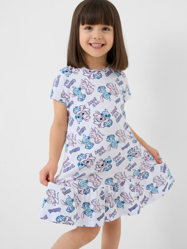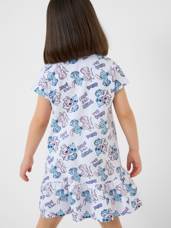 Детская ночная сорочка для девочки. Выполнена из мягкого хлопкового трикотажного материала. Модель прямого кроя, с короткими рукавами и широким воланом по низу, что придаёт ей воздушность и дополнительный объём. Горловина круглая, аккуратно обработана кантом. Главной особенностью дизайна является яркий и весёлый принт с персонажами Лило и Стич.