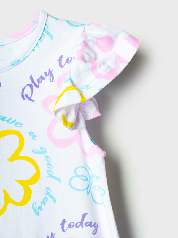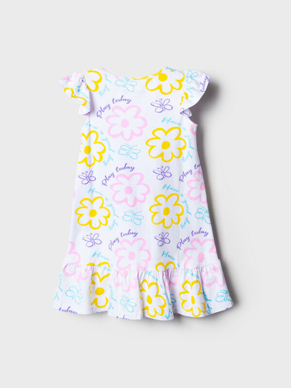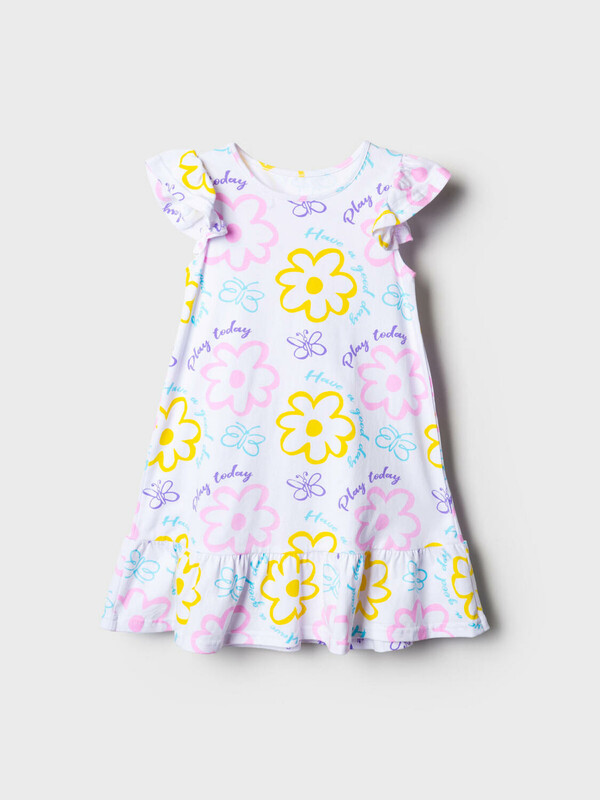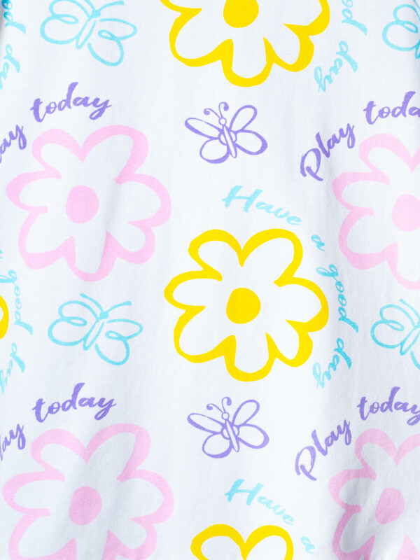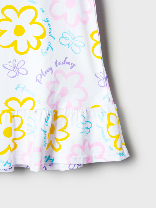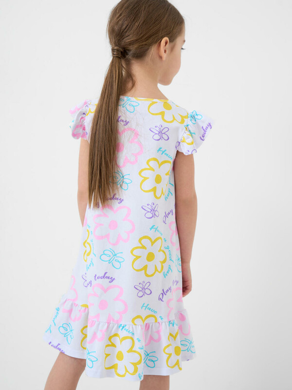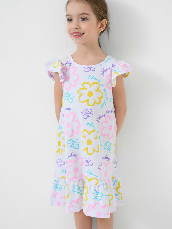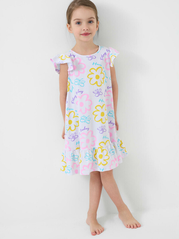 Детская ночная сорочка для девочки. Модель без рукавов из трикотажа, выполненная в прямом силуэте. Круглая горловина и рюши на плечах, придающие образу нежность. По низу сорочки пришита широкая оборка из ткани с контрастным принтом.