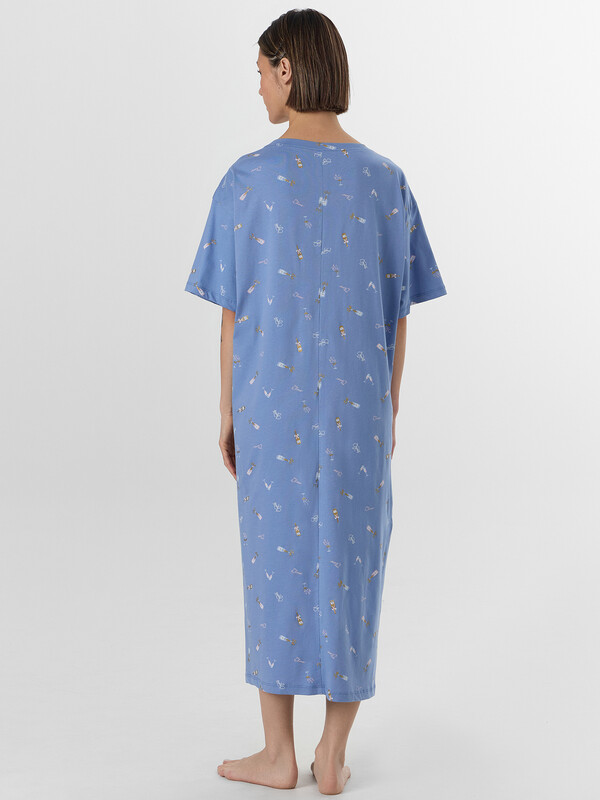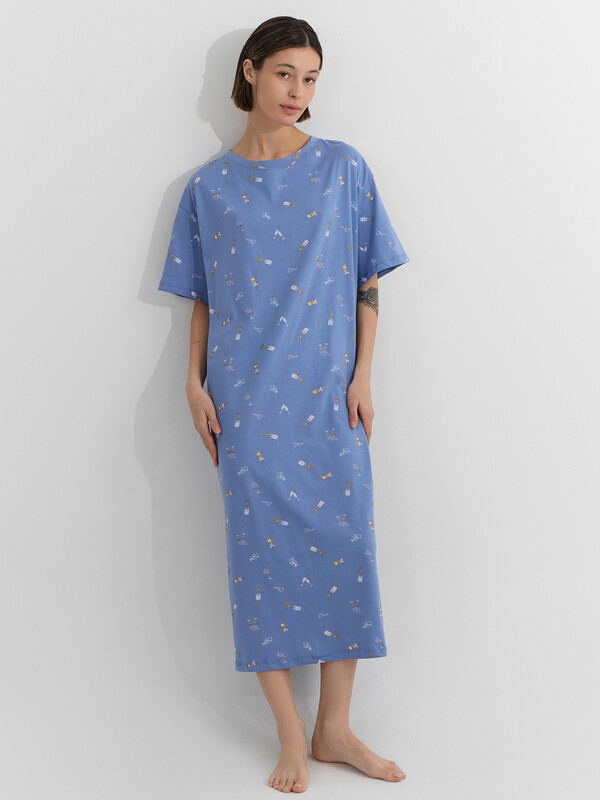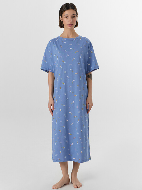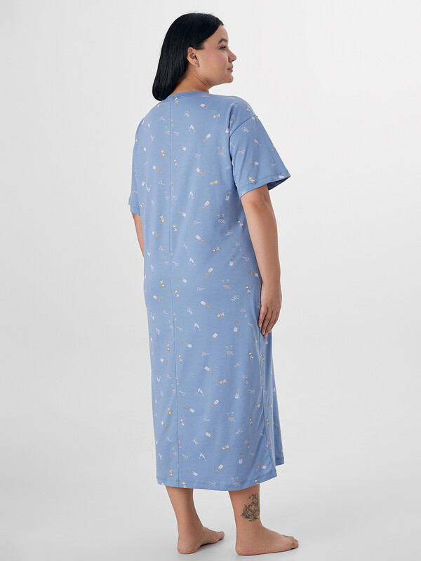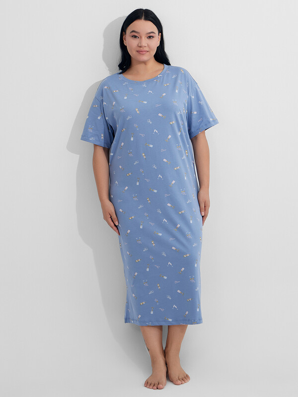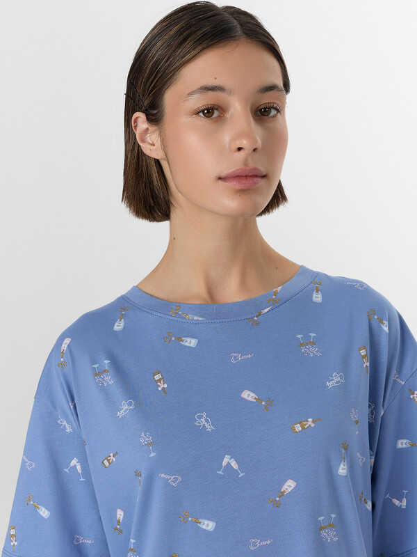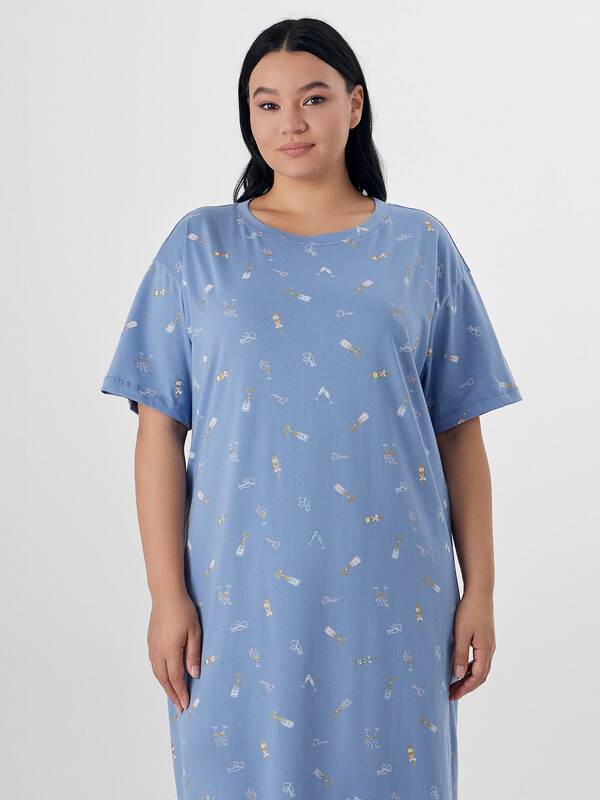 Ночная сорочка с принтом станет идеальной спутницей в предновогодние вечера. Стилизованное изображение бокалов на нежно-голубом фоне создает ощущение волшебной атмосферы и напоминает о приближающемся торжестве. Модель свободного кроя со спинкой, оформленной аккуратным средним швом, обеспечивает комфорт во время сна и отдыха.