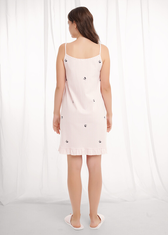 Ночная сорочка из хлопкового трикотажного полотна с добавлением эластана. А-силуэта на узких бретелях. По горловине переда обтачка с кружевом, бант. Отрезной лиф со сборкой. По пройме окантовка. По низу изделия рюша.