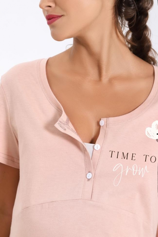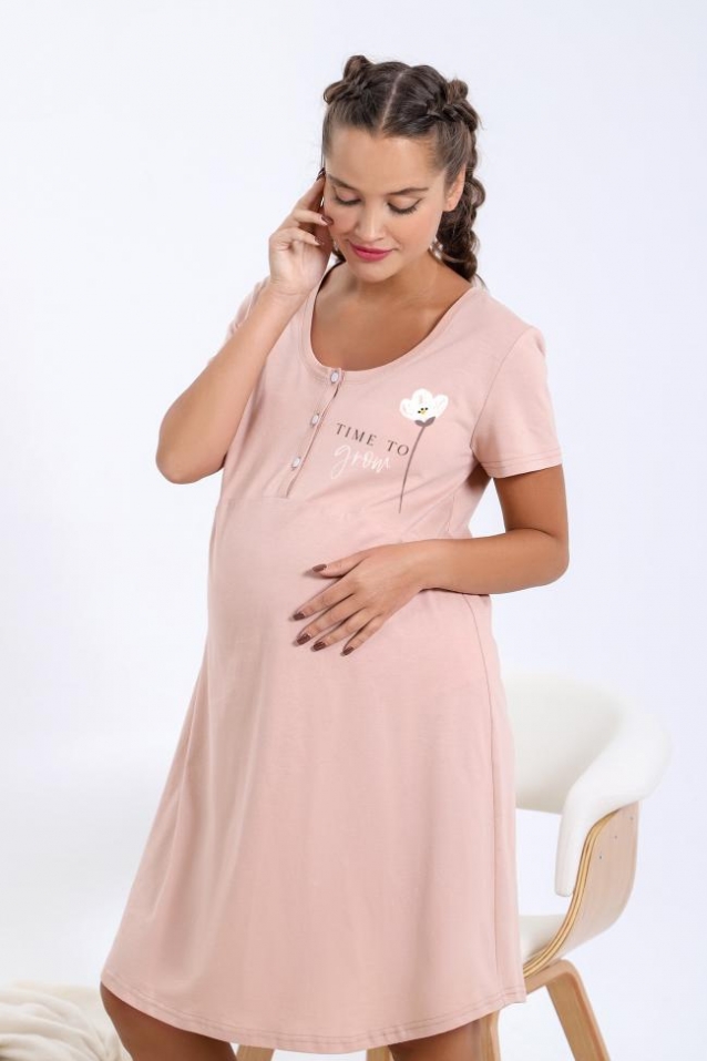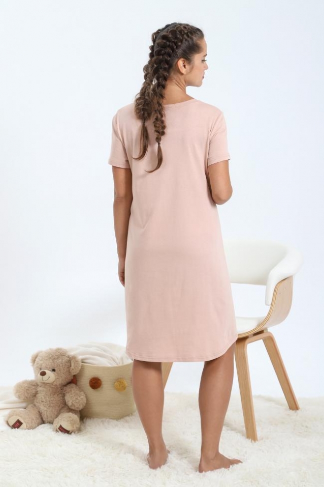 Сорочка женская из трикотажного полотна "кулирка" с набивным рисунком слегка расширенная книзу, с короткими втачными рукавами и горловиной овальной формы, обработанной притачной бейкой и фигурной линией низа. Перед - с отрезной кокеткой с разрезом по центру, обработанным притачными узкими планками и скрепленными между собой тремя пуговицами.