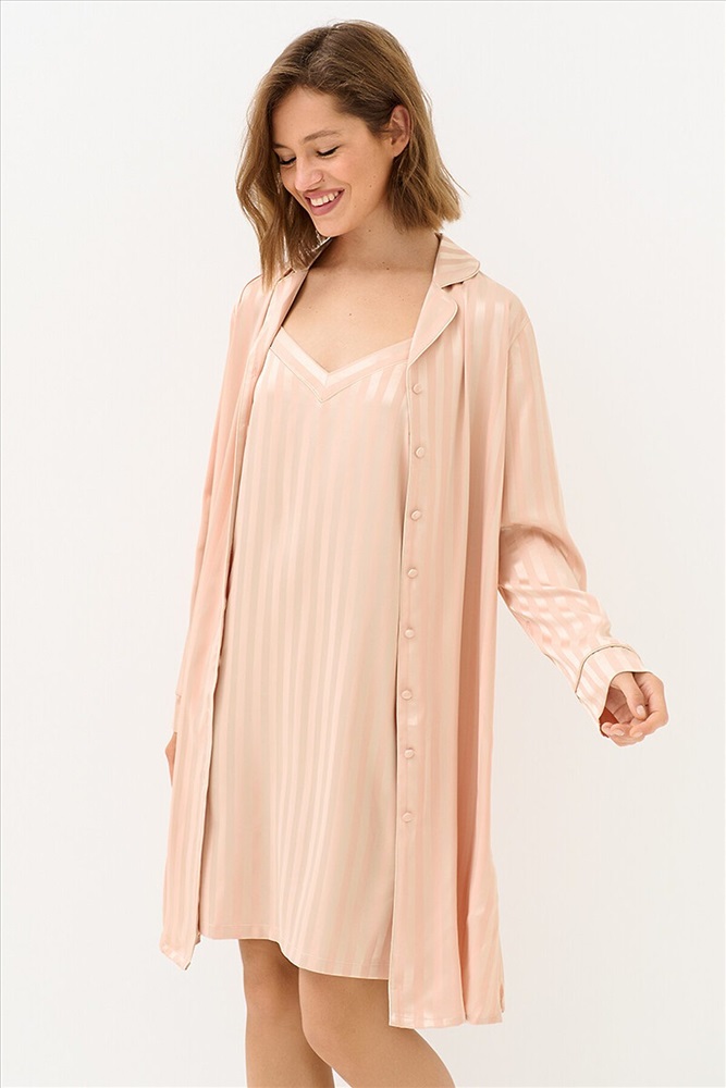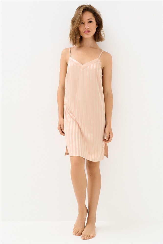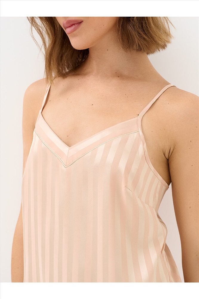 Женская сорочка в лаконичную полоску, длиной выше колена, с V-образным вырезом, однотонным кантом, регулируемыми бретелями и разрезами по бокам. Изготовлена из гладкого и лёгкого искусственного шёлка, который приятно ощущается на теле и хорошо сохраняет форму. Деликатная обработка краёв обеспечивает дополнительный комфорт. Элегантный силуэт и изысканный принт создают образ, в котором сочетаются утончённая женственность и расслабленный домашний шик.