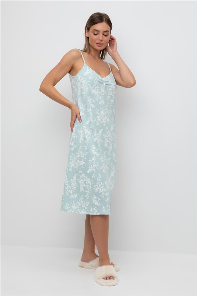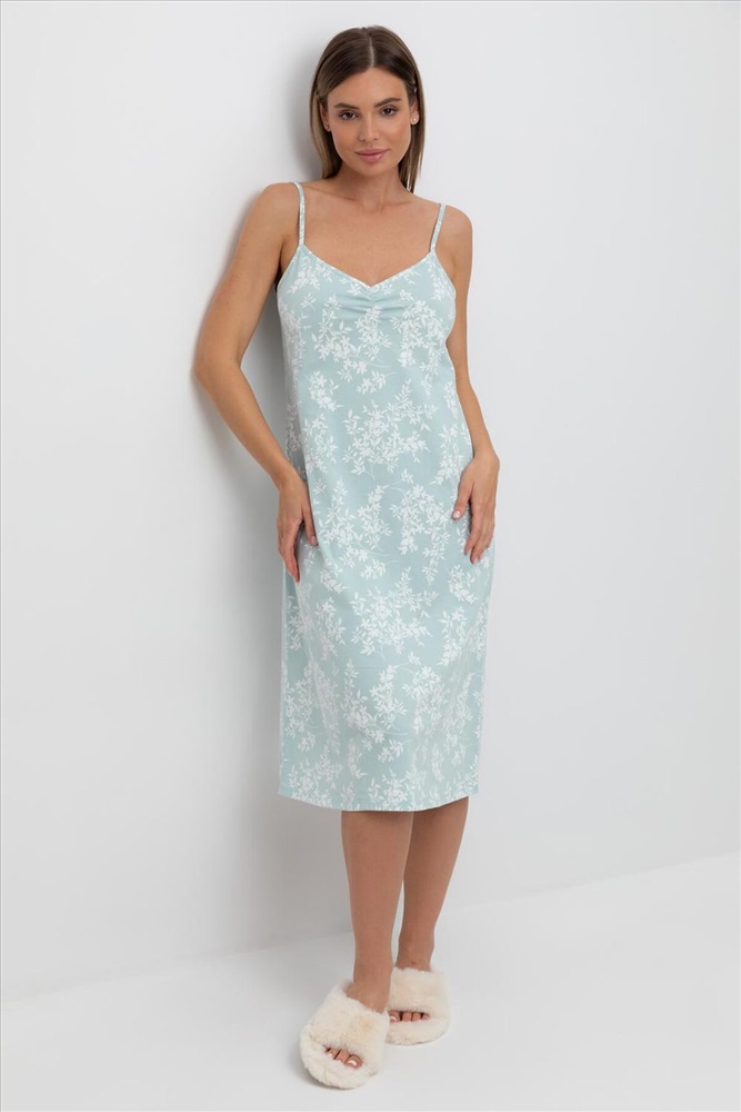 Элегантная женская сорочка с регулируемыми бретелями для комфортного сна. На груди декоративная сборка. Гладкий материал приятен к телу и позволяет коже дышать. Все трикотажные полотна производятся в соответствии с нормами Швейцарского сертификата ЭкоТекс. Сделано в Узбекистане - приталенный силуэт - гипоаллергенные красители - регулировка бретелей