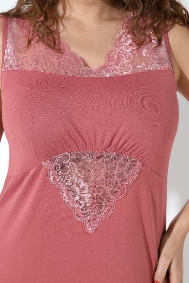 Параметры модели на фото (рост, Ог-От-Об): 176, 96-84-110 Сорочка женская из гладкокрашенного вискозного полотна, прямого силуэта, без рукавов. Полочка состоит из трех частей: на верхней части - притачная кокетка из кружева, образующая V-образный вырез горловины. На нижней части переда – кружевная вставка в форме ромба. Средняя часть присборена по шву притачивания к основной детали. Комментарии к товару