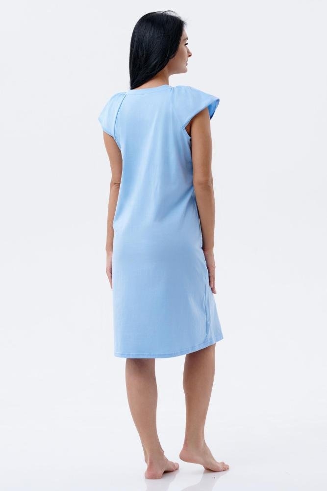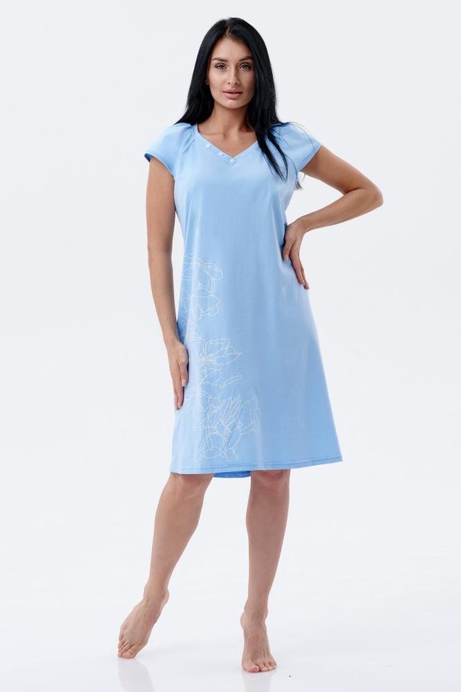 Женская ночная сорочка прямого кроя из качественного хлопкового полотна. Состав ткани и крой сорочки окунут вас в комфортный и сладкий сон. Сорочка с коротким рукавом – реглан. Красивый V-образный вырез горловины с декоративными пуговицами. Длина сорочки до коленей. Полочку украшает крупный принт в виде цветов. Комментарии к товару