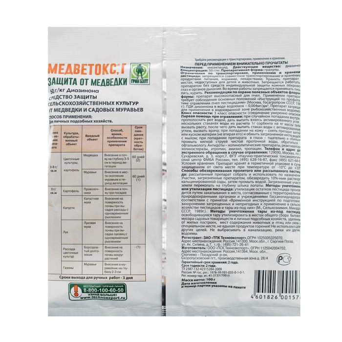 Габариты: 20 x 15 x 2 Доставка: Платная Страна: Россия В боксе: 50 шт Состав: См. на упаковке Материалы: см. на упаковке Фасовка: по 1 шт Индивидуальная упаковка: Без упаковки Сертификат: РСТ Вид средства: Инсектицид Область применения: От всех насекомых Препаративная форма: Гранулы Вид: ХИМпрепараты Вес/Объём: 100 г Мощное оружие от медведки! Красные гранулы усиленного действия - еще эффективнее! Уникальный готовый к применению гранулированный препарат на натуральной основе. Рецепт приманки — основа высокой эффективности препарата. Медведка находит приманку и поедает. Для гибели вредителя достаточно поедания одной гранулы Медветокса. Комментарии к товару