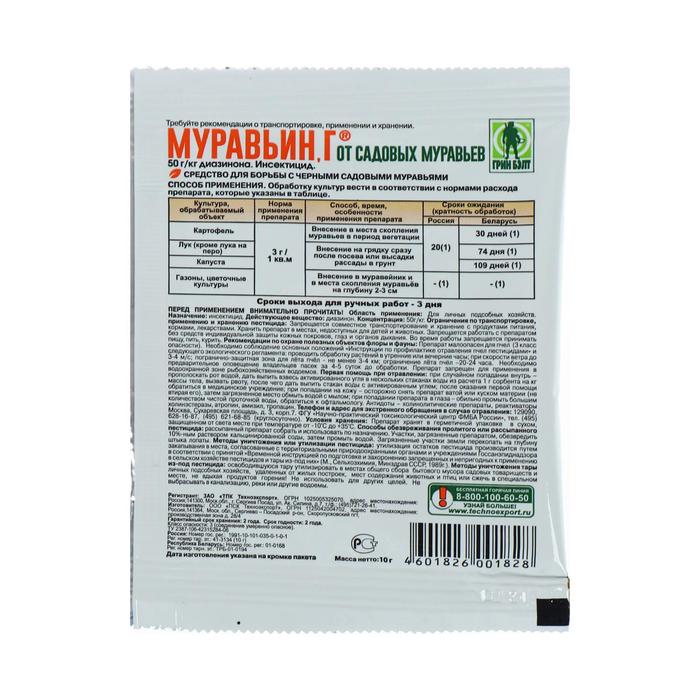 Габариты: 12 x 10 x 0,5 Доставка: Платная Страна: Россия В боксе: 350 шт Состав: См. на упаковке Материалы: см. на упаковке Фасовка: по 1 шт Индивидуальная упаковка: Пакет Сертификат: РСТ Вид средства: Инсектицид Область применения: От всех насекомых Препаративная форма: Порошок Вид: ХИМпрепараты Вес/Объём: 10 г Специальное средство от вредных садовых муравьев. Повышенная безопасность препаративной формы выгодно отличают МУРАВЬИН от аналогичных препаратов. Готовый к применению препарат очень удобен — не нужно ни с чем смешивать или разводить водой. Комментарии к товару