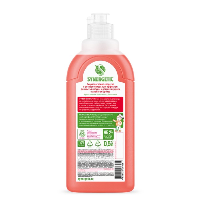 Габариты: 8 x 5 x 21 Доставка: Платная Страна: Россия В боксе: 14 шт Состав: См. на упаковке Материалы: см. на упаковке Фасовка: по 1 шт Индивидуальная упаковка: Без упаковки Сертификат: Не подлежит сертификации Вес, г/Объём, мл: 500 Ароматизированные: Да Аромат: Арбуз Антибактериальное: Да Биоразлагаемый концентрированный гель для посуды с антибактериальным эффектом SYNERGETIC - это экологичное, безопасное и эффективное средство для мытья всех видов посуды, в том числе детской, кухонного инвентаря и детских игрушек от любых видов загрязнений. Он не оставляет следов на посуде. Мягкие биоразлагаемые тензиды из растительного масла обеспечивают хорошее пенообразование и эффективно удаляют жир и запахи даже в холодной воде. Растительный глицерин в составе средства защищает кожу рук от сухости и раздражения. Гипоаллергенная парфюмерная композиция с эфирными маслами бергамота, сантала и лемонграсса придает средству свежий и приятный аромат. Гипоаллергенный гель дерматологически протестирован в Европе. Международный экологический сертификат ICEA подтверждает биоразлагаемость, безопасность и эффективность средства. Биоразлагаемые компоненты не вредят микрофлоре септических установок. Попадая в среду септика, средство «понятно» для микроорганизмов и без труда распадается на простые соединения. Нанести средство на очищаемую поверхность, вымыть поверхность, ополоснуть водой. При приготовлении моющего раствора используйте 5 мл средства на 5 л воды. Область применения: для мытья всех видов посуды, кухонного инвентаря и детских игрушек. Не использовать при аллергии на компоненты соли для ванн. Не применять при наличии острых воспалительных заболеваний, гипотонии, злокачественных образованиях, тромбозе, прочих противопоказаниях к принятию теплых ванн. Состав:Sodium Chloride, Lavandula Angustifolia Flower Oil, Bisabolol. Комментарии к товару