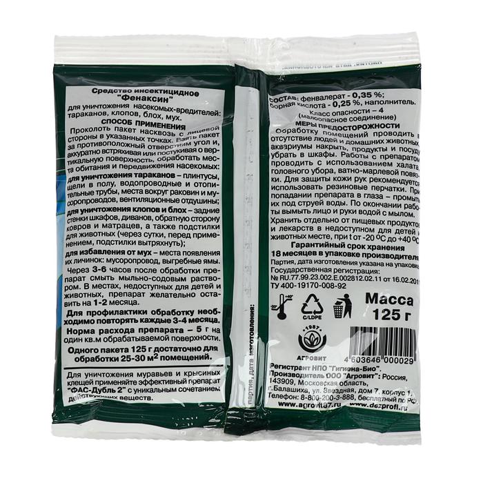 Инсектоакарицидное средство Фенаксин L представляет собой дуст в виде порошка от белого до серого цвета, полностью готовый к применению. Два активных действующих вещества обеспечивают острую инсектоакарицидную активность препарата против насекомых и последующий защитный эффект в течение 6 недель, подходит для уничтожения бытовых насекомыхСОСТАВДействующими веществами его являются: пиретроид лямбда-цигалотрин - 0,03% и представитель неорганических кислот - борная кислота - 0,25%. В его состав входит также масло растительное или минеральное, предотвращающее пыление и наполнители тальк или каолин.СПОСОБ ПРИМЕНЕНИЯ Тараканы: Для борьбы с тараканами дуст используют в местах обитания, скопления, возможного обитания или на путях их проникновения в помещения. Обработку проводят, .нанося дуст тонким слоем, в отверстия и щели в стенах, дверных коробках, порогах, щели вдоль плинтусов, облицовочных покрытий, в места разрушений на вводе и выводе труб водопроводной, отопительной и канализационной систем, под раковинами. Обработку проводят одновременно во всех помещениях, где обнаружены тараканы. При большой численности насекомых обрабатывают и смежные помещения в целях предотвращения заселения их тараканами. Норма расхода: упаковка 100г рассчитана на выборочную обработку помещения площадью 30-50 м2.Муравьи: Для уничтожения рыжих домовых муравьев в помещении следует обработать пути их передвижения ('дорожки) или места скопления в душевых,. котельных, санузлах, складах, базах. При появлении рабочих муравьев обработку следует повторить. Для уничтожения различных видов садовых, которые заползают внутрь помещений, следует нанести дуст тонким слоем на отмостку фундамента дома, по периметру крыльца, террасы или веранды, т.е. на путях проникновения муравьев в помещения.Постельные клопы: Дуст равномерно наносят на места обитания клопов. Скопления насекомых выявляют предварительно перед обработкой. Тонким слоем средство наносят на участки стен, где есть трещины, в щели, за плинтусами, а также на заднюю поверхность мебели, обратную сторону ковров и деревянные стыки кровати. Постельные принадлежности не обрабатывать. Повторные обработки проводят при появлении клопов.Блохи: Для уничтожения блох в помещениях обрабатывают плинтусы, поверхность пола (особенно в. местах отставания линолеума и плинтусов), щели за плинтусами, ковры, дорожки с обратной стороны. При наличии в доме животных (кошки, собаки). обрабатывают места их отдыха: нижнюю сторону подстилок и ковриков, которые через 3 суток вытряхивают, а затем стирают перед последующим использованием. В захламленных подвалах (если очистка их затруднена), то можно увеличить вдвое.Мухи: Средство используют для обработки мест посадки мух на открытом воздухе, обрабатывая. мусоросборники, контейнеры, а также допускается обработка мусорокамер в подвалах. Повторные обработки проводят по энтомологическим показаниям - появлении: окрыленных мух или обнаружении личинок или куколок мух в мусорокамерах и мусоросборниках, чтобы предотвратить вылет имаго.Крысиные клещи: Для уничтожения крысиных клещей обрабатывают, в первую очередь, места проникновения грызунов в помещения и пути их перемещения: лазы, трубы различных коммуникаций, плинтусы, стены и полы вдоль них. Затем места возможной концентрации клеще