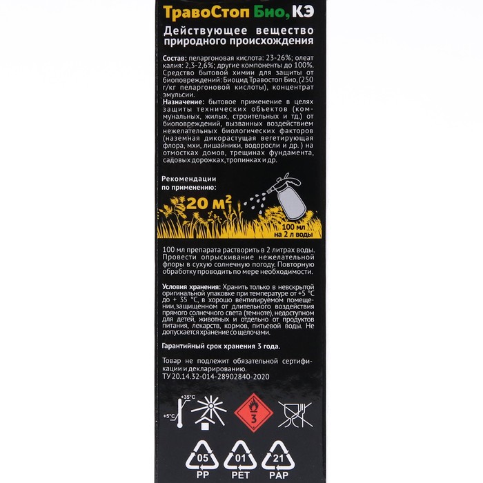 Габариты: 4 x 4 x 13 Страна: Россия В боксе: 12 шт Состав: См. на упаковке Материалы: см. на упаковке Фасовка: по 1 шт Индивидуальная упаковка: Цветная картонная коробка Сертификат: Не подлежит сертификации Область применения: Для сплошного уничтожения Вес/Объём: 100 мл Средство от сорняков Биоцид ТравоСтоп Био КЭ, объемом 50 мл, является эффективным решением для борьбы с нежелательными растениями на участке. Препарат разработан с использованием инновационных технологий и содержит в своем составе натуральные компоненты, что делает его безопасным для окружающей среды и здоровья человека. ТравоСтоп Био КЭ обладает широким спектром действия и может использоваться для уничтожения различных видов сорняков, включая труднодоступные корни. Препарат быстро впитывается и начинает действовать уже через несколько часов после обработки. Для получения максимального эффекта необходимо применять ТравоСтоп Био КЭ на растения в период их активного роста. Рекомендуется наносить препарат на листья и стебли с помощью распылителя или кисточки. Обратите внимание, что при использовании ТравоСтоп Био КЭ необходимо соблюдать меры предосторожности при работе с препаратом следует использовать защитные перчатки и маску, а также избегать попадания на кожу и слизистые оболочки. Средство от сорняков Биоцид ТравоСтоп Био КЭ – это надежный помощник в борьбе за идеальный участок без нежелательных растений. Приобретайте препарат уже сегодня и наслаждайтесь красивым и ухоженным садом или огородом! Комментарии к товару