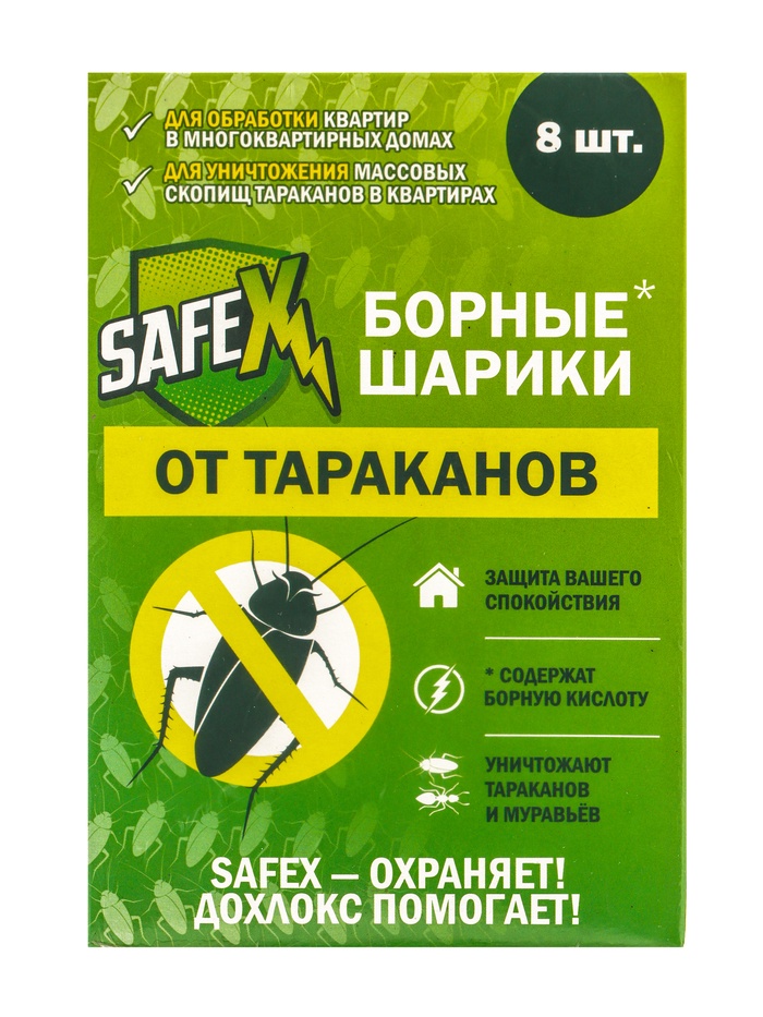 Набор инсектицидных шариков SAFEX — это готовая приманка для уничтожения тараканов с пролонгированным действием. Комплект из двух упаковок создаёт барьер в местах вероятного появления насекомых.