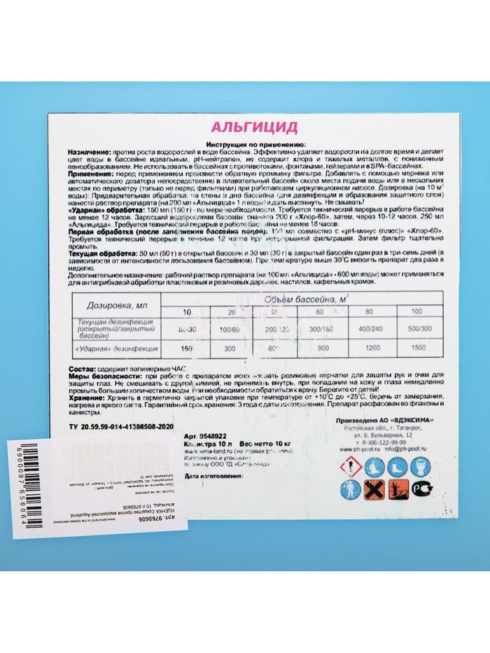 Габариты: 23 x 18 x 28 Страна: Россия В боксе: 1 шт Состав: См. на упаковке Материалы: см. на упаковке Фасовка: по 1 шт Индивидуальная упаковка: Без упаковки Сертификат: Не подлежит сертификации Причина уценки: нетоварный вид Вес, кг/Объём, л: 10 Вид средства: Альгицид Форма выпуска: Жидкость Средство предназначено против роста водорослей в воде бассейна. Эффективно удаляет водоросли на долгое время и делает цвет воды в бассейне идеальным, рН нейтрален, не содержит хлора и тяжёлых металлов, с пониженным пенообразованием. Не рекомендуется использовать в бассейнах с противотоками, фонтанами, гейзерами и в спа-бассейнах. Способ применения: перед использованием произвести обратную промывку фильтра. Добавлять с помощью мерника или автоматического дозатора непосредственно в плавательный бассейн около места подачи воды или в нескольких местах по периметру (только не перед фильтрами) при работающем циркуляционном насосе. Способ применения: дозировка на 10 м³ воды: предварительная обработка: на стены и дно бассейна (для дезинфекции и образования защитного слоя) нанести раствор препарата (на 200 мл альгицида 1 л воды) и дать высохнуть. Не смывать! Ударная обработка: 150 мл — по мере необходимости. Требуется технический перерыв в работе бассейна не менее 12 часов. Заросший водорослями бассейн: сначала 200 г средства "Хлор-60", через 10–12 часов — 250 мл альгицида. Требуется технический перерыв в работе бассейна не менее 18 часов. Первая обработка (после заполнения бассейна водой): 150 мл совместно с "pН-пул" и "Хлор-60". Требуется технический перерыв в течение 12 часов при непрерывной фильтрации. Затем фильтр тщательно промыть. Текущая обработка: 50 мл в открытый бассейн и 30 мл в закрытый, один раз в 3–7 дней (в зависимости от интенсивности пользования бассейном). При температуре выше +30 °С вносить препарат два раза в неделю. Дополнительное назначение: рабочий раствор препарата (на 100 мл альгицида — 600 мл воды) может применяться для антигрибковой обработки пластиковых и резиновых дорожек, настилов, кафельных кромок. Меры безопасности: при работе с препаратом использовать резиновые перчатки для защиты рук и очки для защиты глаз. Не смешивать с другой химией, не принимать внутрь, при попадании на кожу и глаза немедленно промыть большим количеством воды, при необходимости обратиться к врачу. Берегите от детей! Хранение: держать в герметично закрытой упаковке при температуре +10…+25 °С, беречь от замерзания, нагрева и яркого света. Срок хранения: 3 года с даты изготовления. Состав: содержит полимерные ЧАС. Комментарии к товару