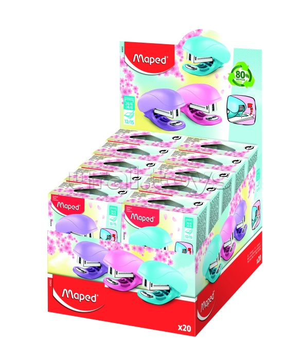 Мини-степлер Vivo в пастельных оттенках - компактный и практичный. Новинка 2023! • Компактный размер, удобный для хранения • Корпус на 80 % состоит из переработанного пластика • Количество пробиваемых листов: до 15 (70 г/м2) • Закрытый тип сшивания • Встроенный антистеплер • Количество и тип скоб: 41 шт. 24/6 или 58 шт. 26/6 • Глубина закладки бумаги: 29 мм • Размеры: 30×67×45 мм Картонная упаковка с европодвесом. Поставляется в дисплее. "