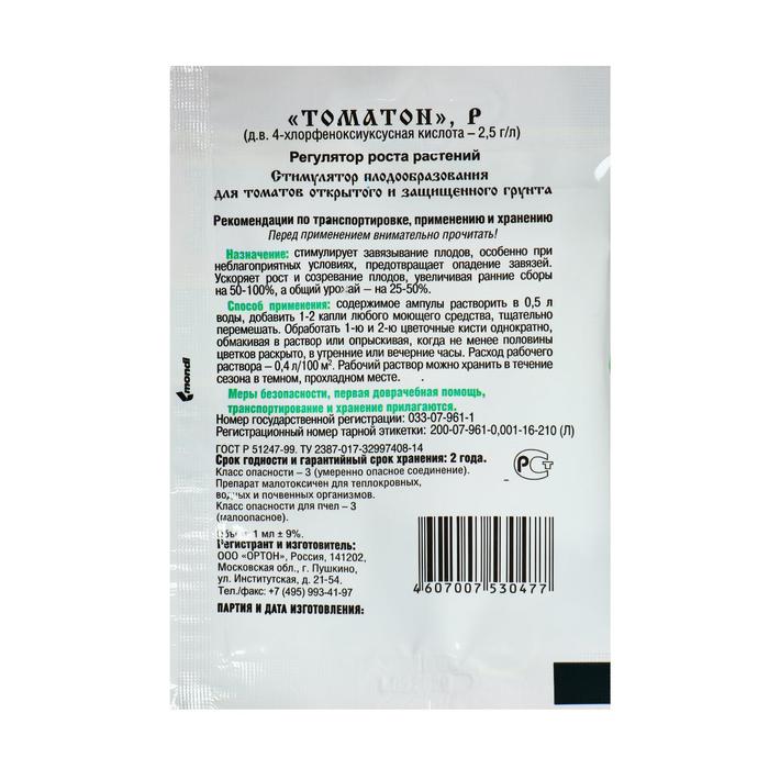 Габариты: 12,5 x 9 x 0,1 Страна: Россия В боксе: 100 шт Состав: См. на упаковке Материалы: см. на упаковке Фасовка: по 1 шт Индивидуальная упаковка: Без упаковки Сертификат: СТР Вид средства: Стимулятор роста Область применения: Стимулятор иммунитета Область применения: Для овощей Происхождение: Минеральные (неорганические) Препаративная форма: Жидкость Вид: Стимуляторы Периоды применения: Круглогодичные Комплексные удобрения: Нет Класс опасности: 3 класс (умеренно опасные) Группы элементов: Макроудобрения Эффект: Увеличение урожая Вес/Объём: 1 мл «ТОМАТОН» • 100 % завязывание плодов • Ранний и обильный урожай • Регулятор роста растений • Стимулятор плодообразования для томатов открытого и защищенного грунта Назначение: стимулирует завязывание плодов, особенно при неблагоприятных условиях, предотвращает опадение завязей. Ускоряет рост и созревание плодов, увеличивая ранние сборы на 50-100%, а общий урожай на 25-50%. Способ применения: содержимое ампулы растворить в 0,5 л воды, добавить 1-2 капли любого моющего средства, тщательно перемешать. Обработать 1-ю и 2-ю цветочные кисти однократно, обмакивая в раствор или опрыскивая, когда не менее половины цветков раскрыто, в утренние или вечерние часы. Расход рабочего раствора - 0,4 л/100 м2. Рабочий раствор можно хранить в течение сезона в темном, прохладном месте. Комментарии к товару