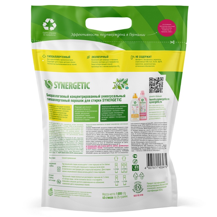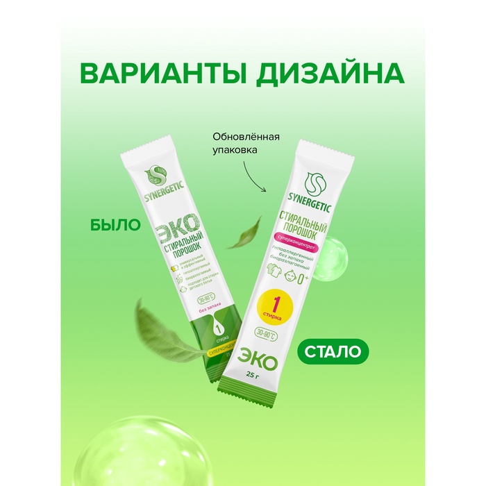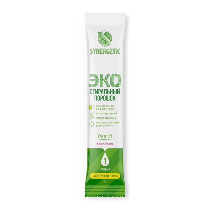 Стиральный порошок SYNERGETIC - экологичный, безопасный, универсальный, гипоаллергенный и эффективный суперконцентрат в стиках. Биоразлагаемый порошок создан на основе безопасных растительных компонентов, не вызывает раздражения кожи, аллергии, не оставляет запаха и подходит для стирки детского белья 0+ и одежды людей с чувствительной кожей.