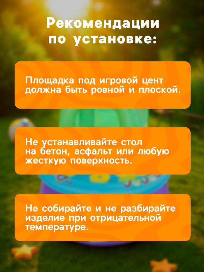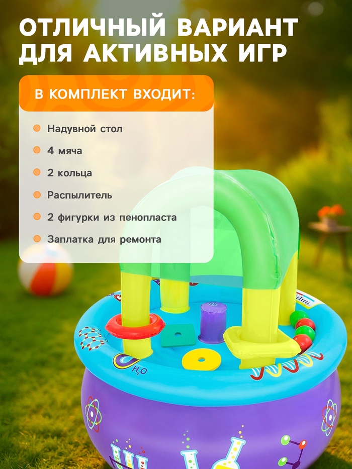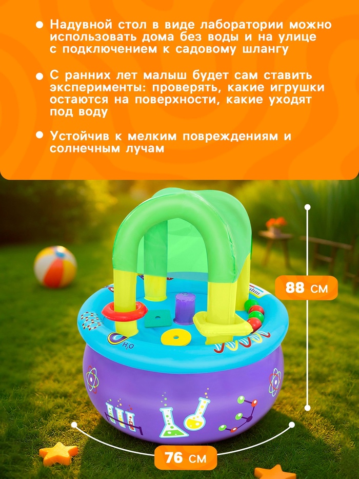 Габариты: 31 x 31 x 11 Артикул поставщика: 52573 Страна: Китай В боксе: 3 шт Состав: ПВХ Материалы: ПВХ Фасовка: по 1 шт Индивидуальная упаковка: Цветная коробка Сертификат: ЕАС Длина, см: 76 Ширина, см: 76 Высота, см: 86 Возраст: От 1.5 лет Особенности: С игрушками Надувное дно: Да Темпер. ограничение НЕ НИЖЕ ℃: 0 Фиксированная цена: Да Надувной стол в виде лаборатории можно использовать дома без воды и на улице с подключением к садовому шлангу. С ранних лет малыш будет сам ставить эксперименты: проверять, какие игрушки остаются на поверхности, какие уходят под воду. Комплектация