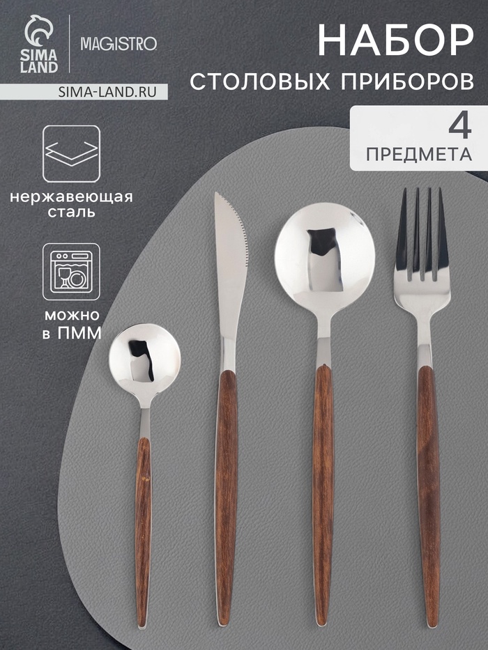 Габариты: 25,5 x 17,5 x 3 Страна: Китай В боксе: 24 набор Состав: Нержавеющая сталь, пластик Материалы: нержавеющая сталь, пластик Фасовка: по 1 набор Индивидуальная упаковка: Картонная коробка Габариты товара: 28 см × 18 см × 3,5 см Сертификат: СТР Набор: Да Цвет: Серебристый Количество персон: 1 В наборе, шт.: 4 Материал ручки: Пластик Вид упаковки: Коробка картонная Рисунок: Нет Материал: Нержавеющая сталь Для детей до 3 лет: Нет Назначение: Столовые Можно мыть в посудомоечной машине: Да Цвет ручки: Коричневый Состав набора: Ложка чайная, Ложка столовая, Нож столовый, Вилка столовая Матовая поверхность: Нет Внешний вид: Без особенностей Набор столовых приборов Magistro имеет современный минималистичный дизайн с четкими контурами и отсутствием декоративных элементов, поэтому его можно использовать для сервировки практически в любом стиле. Приборы изготовлены из высококачественной нержавеющей стали, имеют удобные пластиковые ручки, что делает их комфортными для использования людьми всех возрастов. Не подходят для мытья в посудомоечной машине. Преимущества товара: