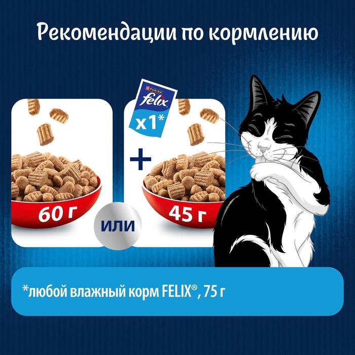 Габариты: 29 x 10 x 27 В боксе: 8 шт Вес, кг: 1,3 Доставка: Платная Страна: Россия Состав: См. на упаковке Материалы: см. на упаковке Фасовка: по 1 шт Индивидуальная упаковка: Без упаковки Сертификат: СТР Особенности корма: Основной Вкус: Говядина Форма упаковки: Tetra Pak Возраст животного: Взрослые кошки (от 1 до 7 лет) Тип корма: Сухой Меркурий: Да Фиксированная цена: Да Любопытство Вашего кота заложено природой! И бренд Felix® снова придумал, как его удовлетворить. Представляем Felix® Двойная Вкуснятина® – сухой корм для кошек, который полностью соответствует потребностям Вашего озорника. Восхитительное сочетание двух текстур в одной упаковке: хрустящие гранулы смешаны с мягкими кусочками для создания невероятного вкуса, перед которым невозможно устоять! Широкий ассортимент позволит коту наслаждаться разнообразием мясных или рыбных вкусов с соблазнительными ароматами. Felix® Двойная Вкуснятина® - первый сухой корм, созданный под брендом Felix® для находчивого кота, который знает толк во вкусной еде. •Не содержит искусственных красителей и консервантов •Сочетание хрустящих гранул с мягкими и нежными кусочками •100% сбалансированный полный рацион •Содержит витамины А, Д, Е и таурин Совет от Felix®: Вы пробовали комбинировать сухой и влажный корм в ежедневном рационе Вашего кота? Попробуйте! Ведь теперь Felix® доступен в обоих рационах. Рекомендации по кормлению: Рекомендуемая суточная норма зависит от погодных условий, уровня активности кошки и ее физических особенностей. Индивидуальные потребности кошки могут варьироваться, и ежедневное количество корма должно быть скорректировано по мере необходимости для поддержания оптимального веса Вашей кошки. Следите, чтобы у Вашей кошки всегда была свежая чистая питьевая вода. Достаточное ежедневное потребление воды - обязательное условие здоровья Вашего питомца. Гарантированные показатели: белок: 34%, содержание жира: 12,5%, сырая зола: 8%, сырая клетчатка: 3%, незаменимые жирные кислоты: 2,5%. Состав:злаки, мясо и продукты переработки мяса (мин. 4% мяса на базе восстановленного вещества), продукты переработки растительного сырья, масла и жиры, экстракты растительного белка, глицерол, консерванты, минеральные вещества, дрожжи, сахара, аминокислоты, витамины, красители, антиоксиданты. Комментарии к товару