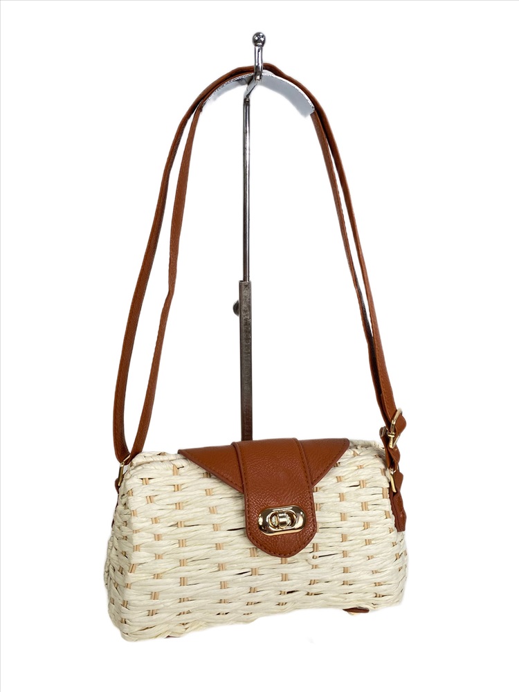 Компактная женская плетеная сумка с кожаным плечевым ремнём. Отличный летний аксессура, вмещает телефон, кошелёк, ключи, очки и другие необходимые мелочи. Закрывается на повортный замок, внутри одно основное отделение.