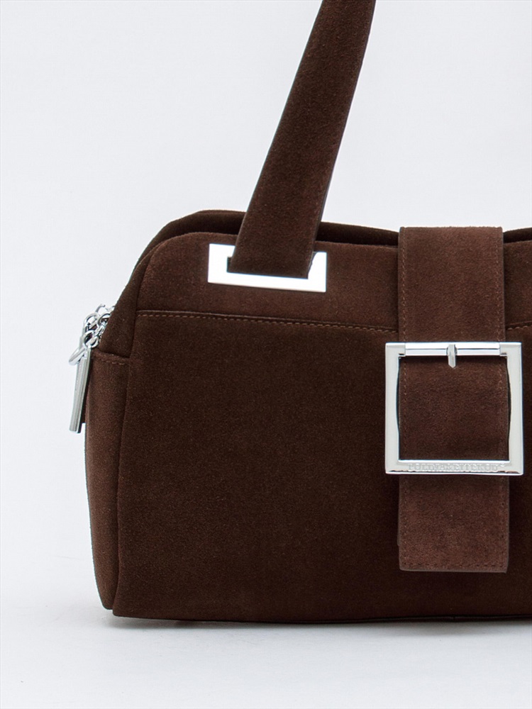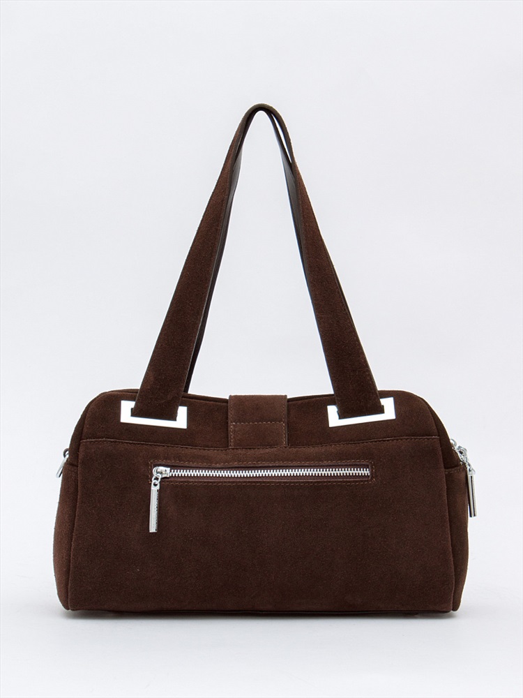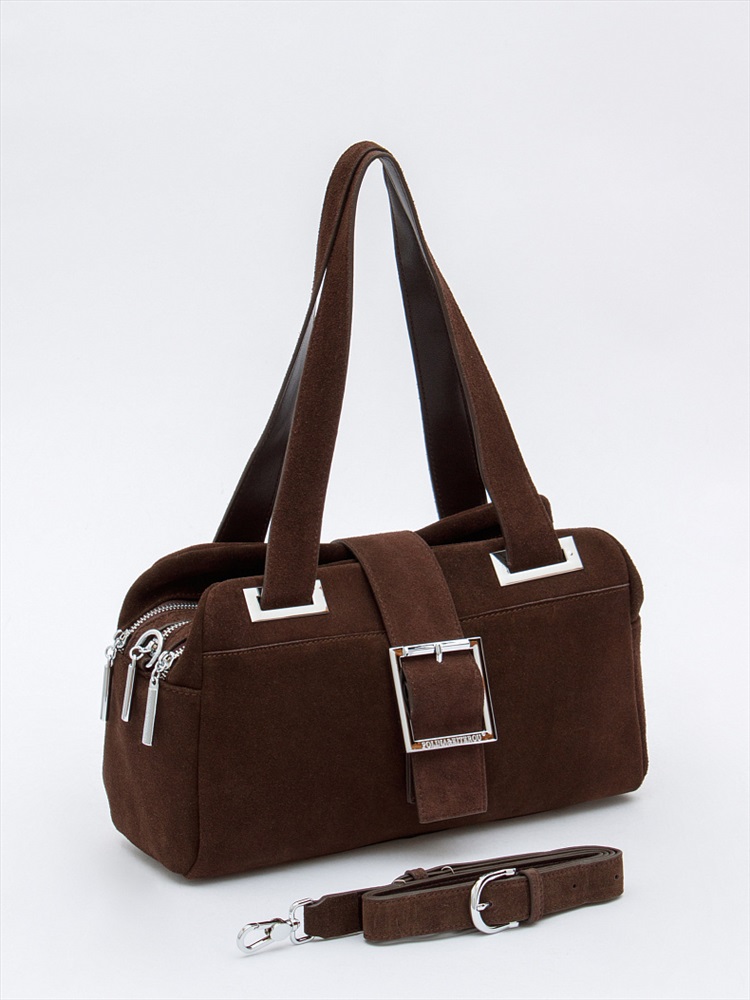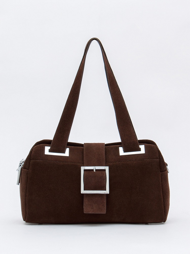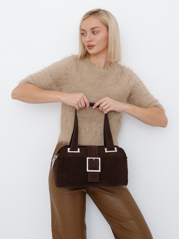Материал: Замша Базовая сумка на каждый день выполнена из натуральной замши. Декорирована пряжкой на хлястике. Дополнена серебристой фурнитурой.